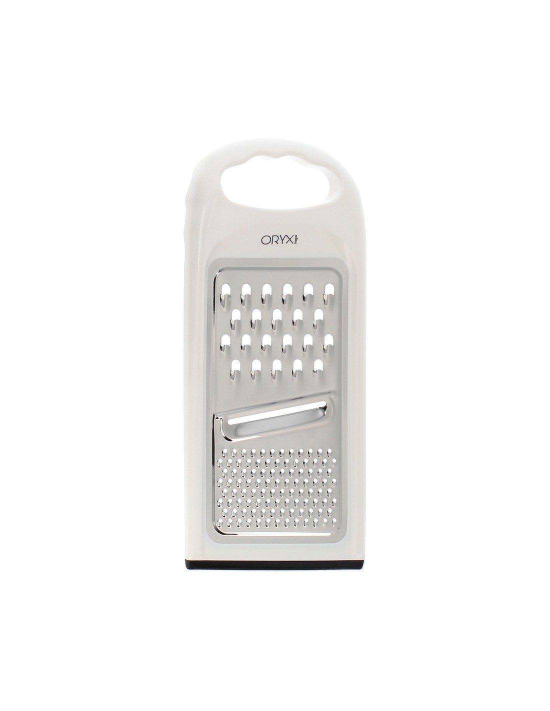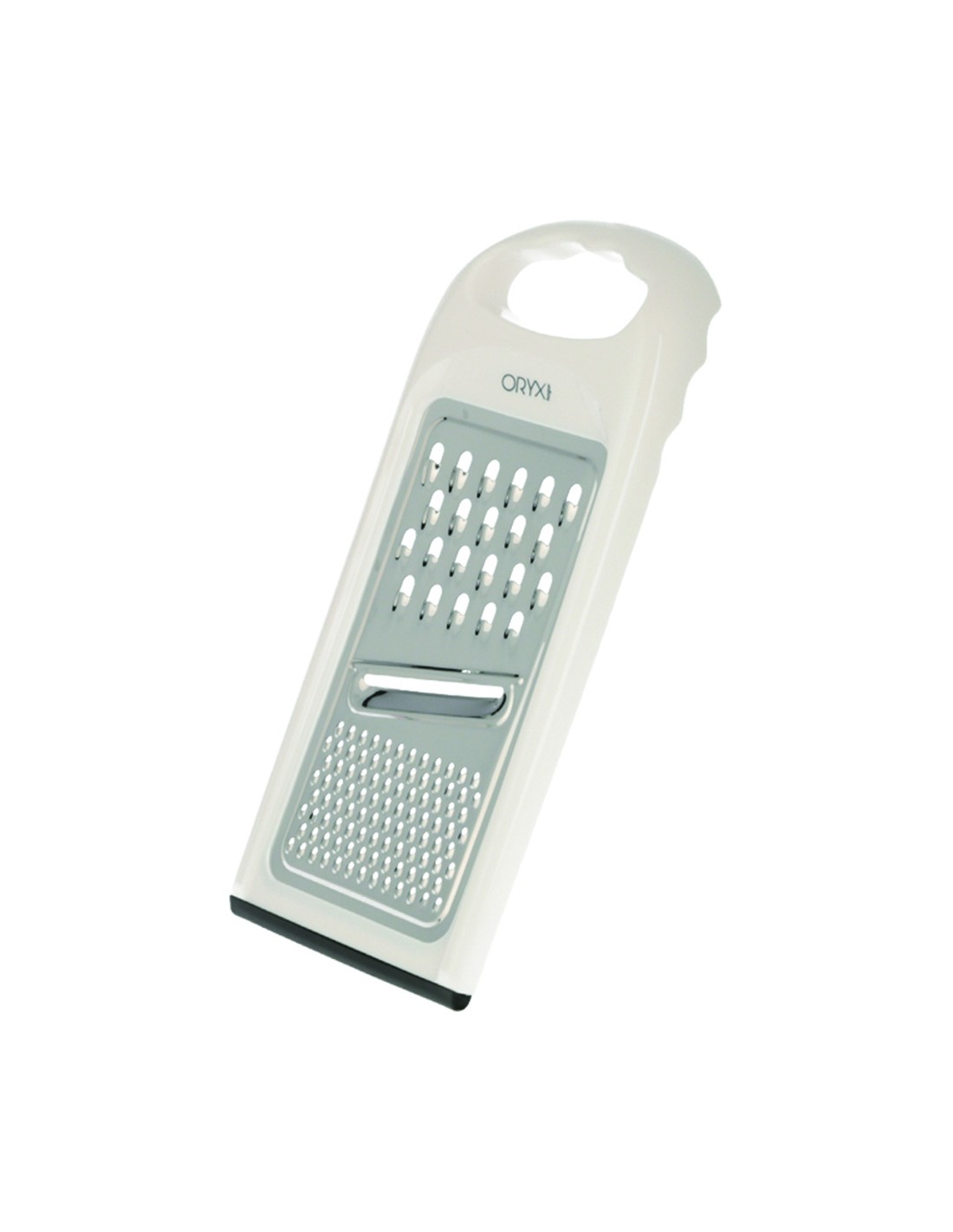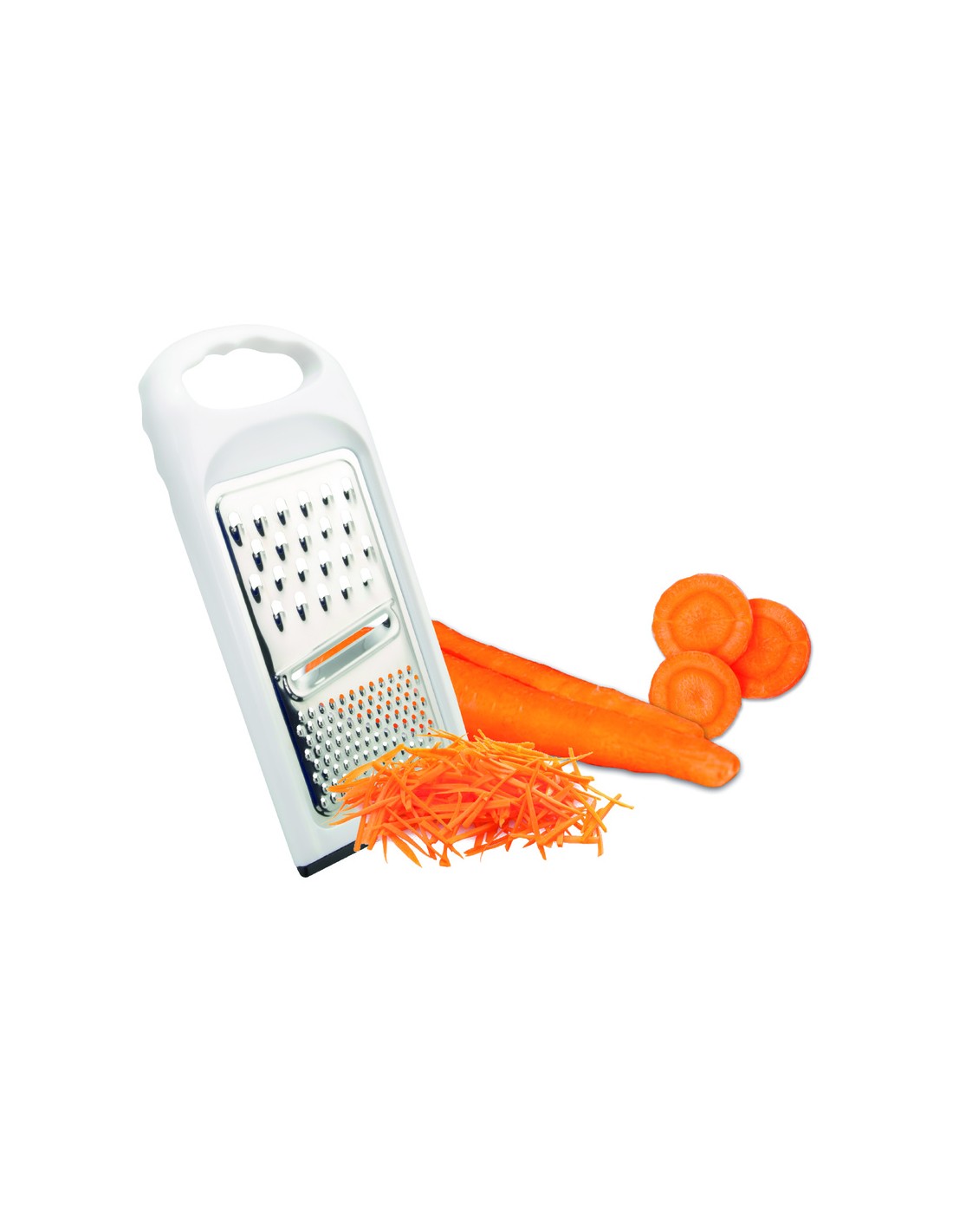 - Rallador de acero inoxidable con cuerpo de plástico blanco ABS y base antideslizante.