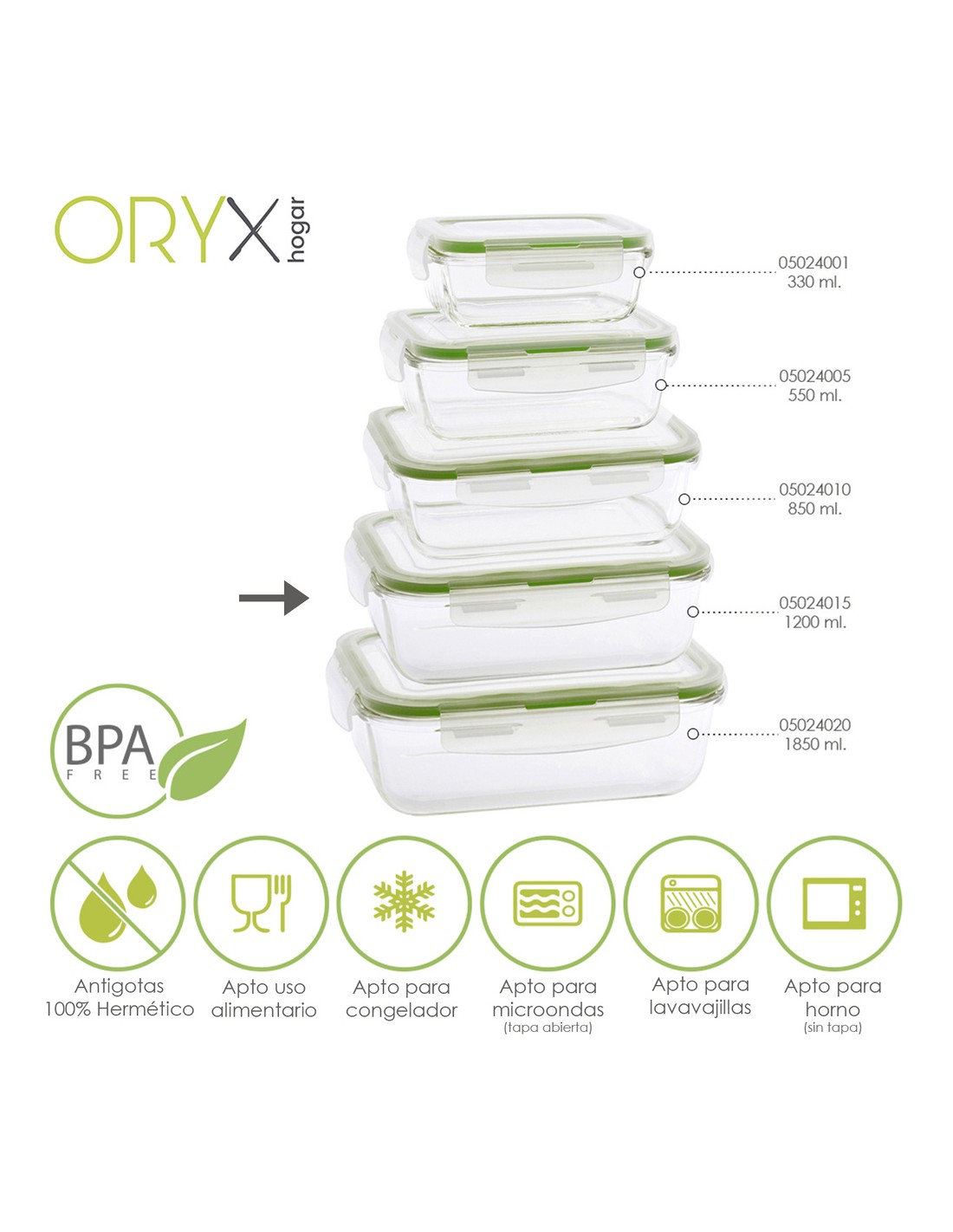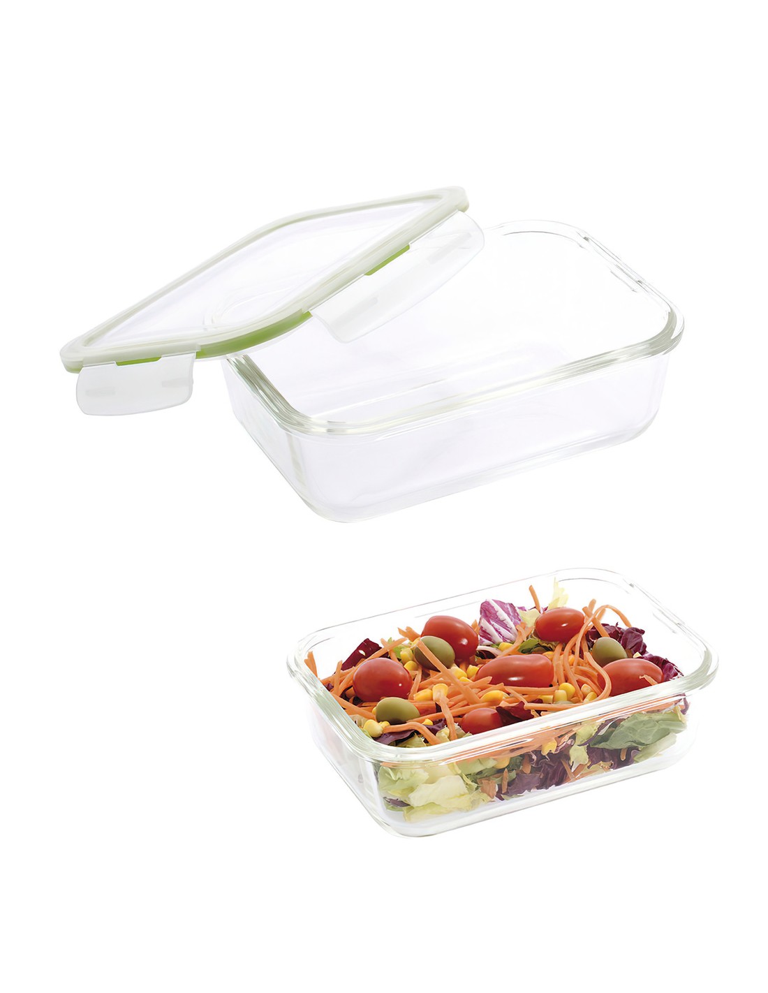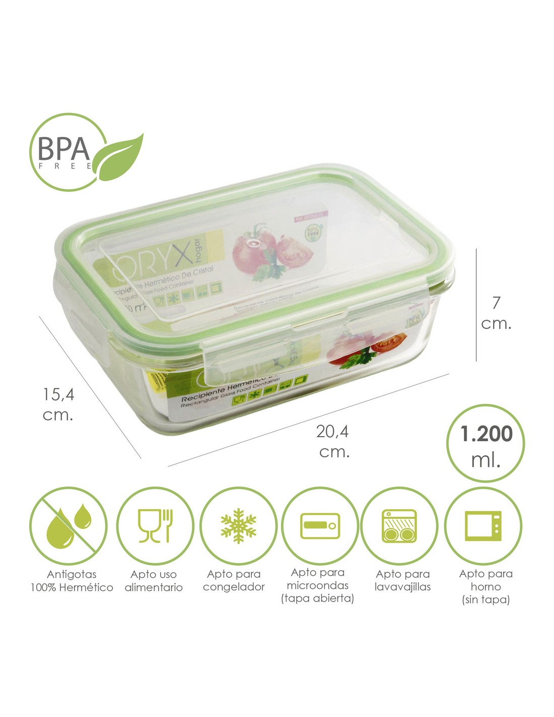 - Recipientes herméticos para una mejor conservación y un transporte sin derrames, no conserva olor ni sabor de alimentos contenidos anteriormente. Las tapas cuentan con un sistema de 4 cierres de bloqueo además están realizadas en silicona inyectada que se adhiere al cristal aislando los alimentos de gérmenes y olores externos y favoreciendo su perfecta conservación.