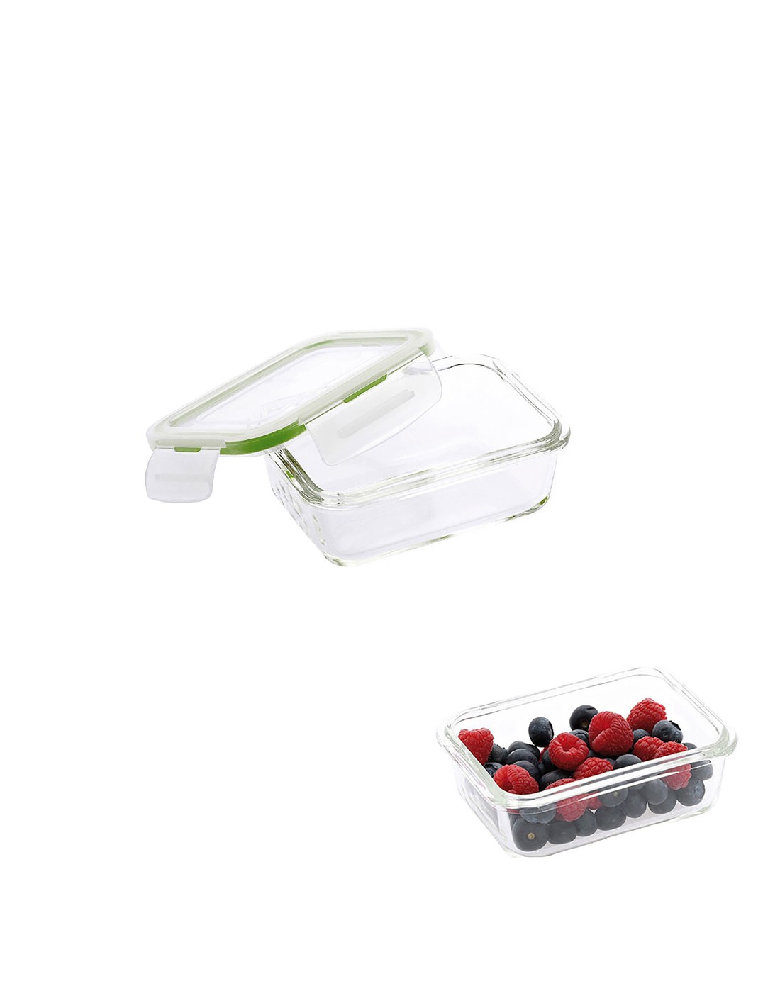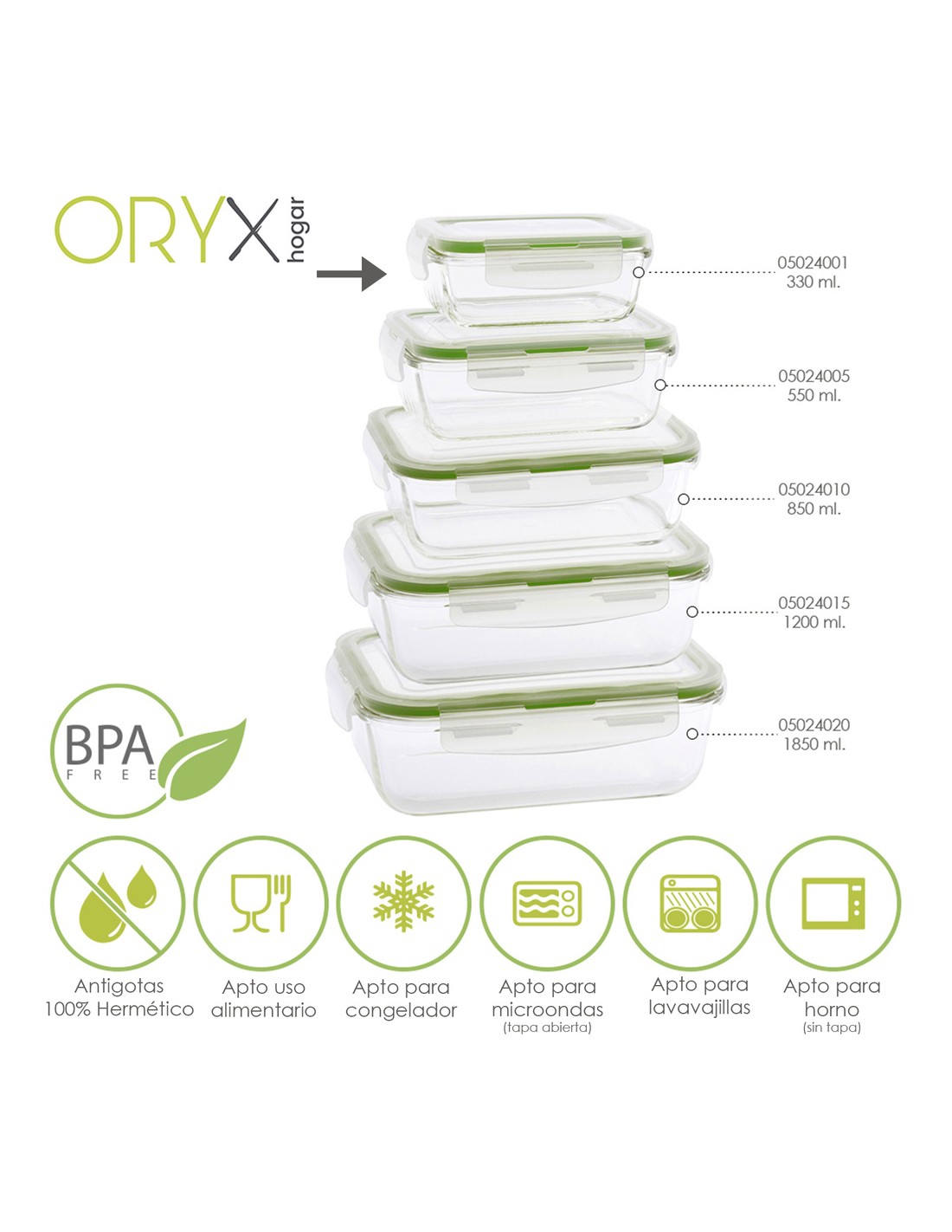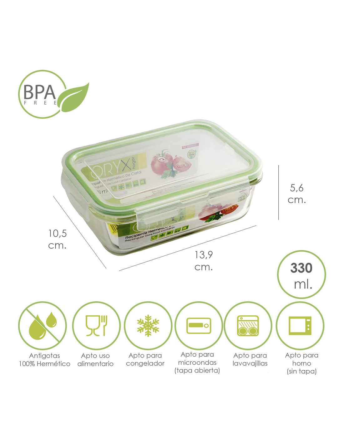 - Recipientes herméticos para una mejor conservación y un transporte sin derrames, no conserva olor ni sabor de alimentos contenidos anteriormente. Las tapas cuentan con un sistema de 4 cierres de bloqueo además están realizadas en silicona inyectada que se adhiere al cristal aislando los alimentos de gérmenes y olores externos y favoreciendo su perfecta conservación.