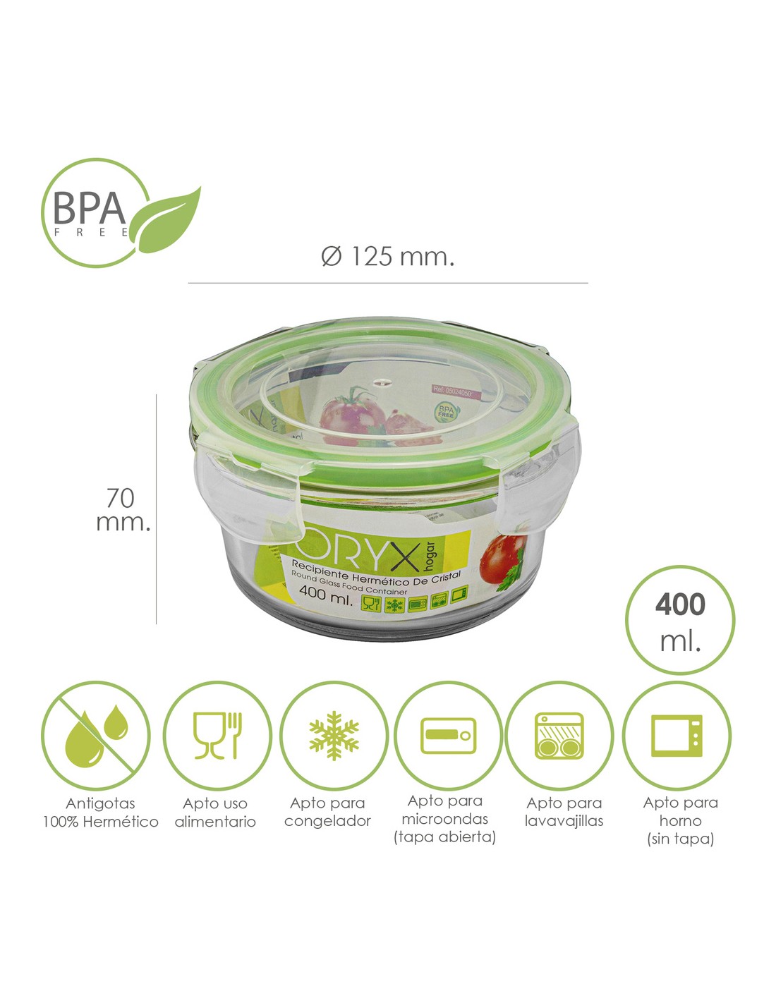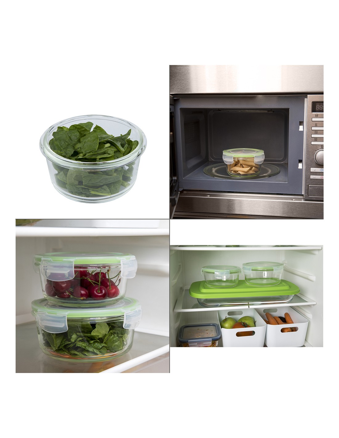 - Recipientes herméticos para una mejor conservación y un transporte sin derrames, no conserva olor ni sabor de alimentos contenidos anteriormente. Las tapas cuentan con un sistema de 4 cierres de bloqueo además están realizadas en silicona inyectada que se adhiere al cristal aislando los alimentos de gérmenes y olores externos y favoreciendo su perfecta conservación.