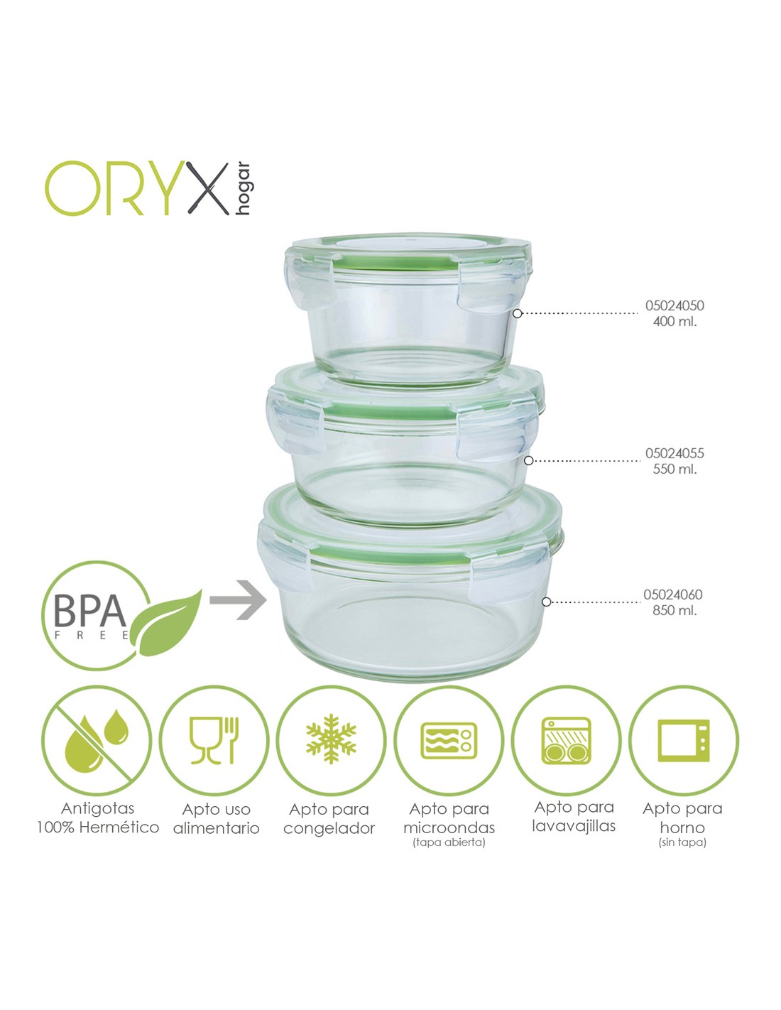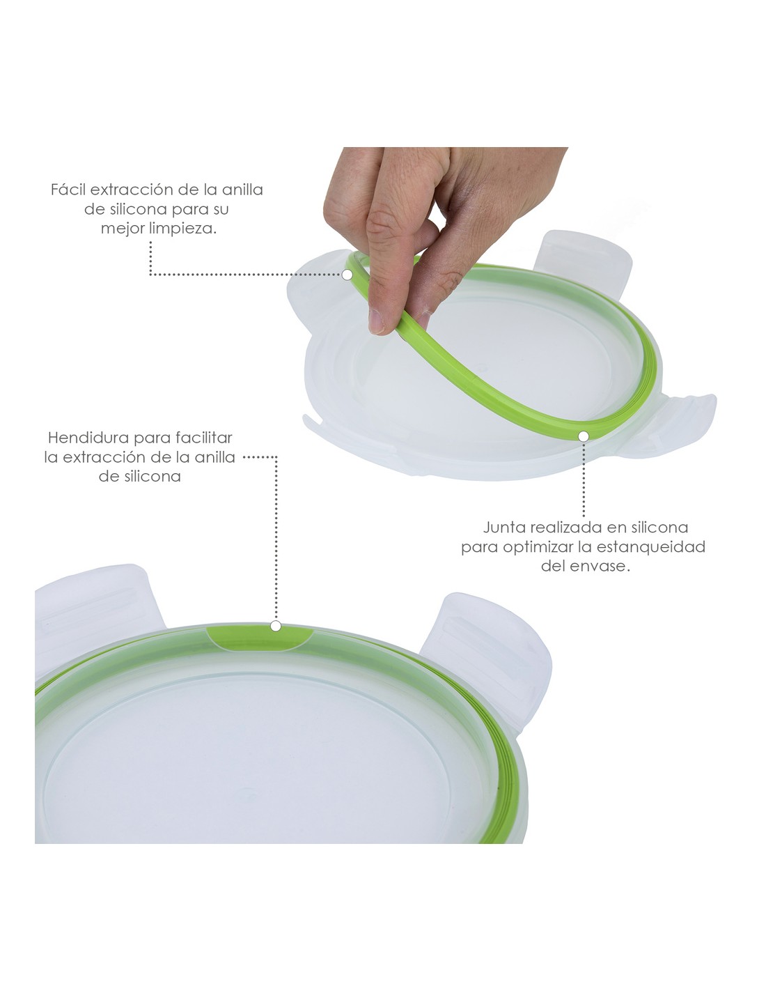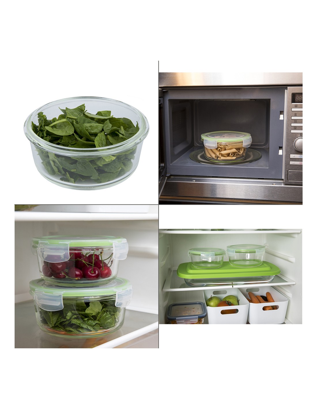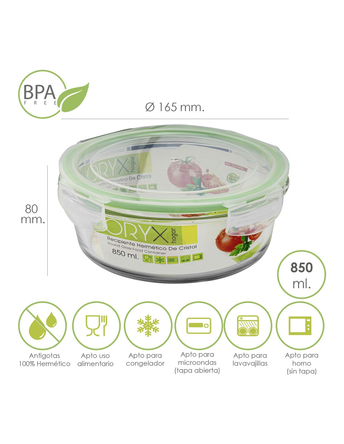- Recipientes herméticos para una mejor conservación y un transporte sin derrames, no conserva olor ni sabor de alimentos contenidos anteriormente. Las tapas cuentan con un sistema de 4 cierres de bloqueo además están realizadas en silicona inyectada que se adhiere al cristal aislando los alimentos de gérmenes y olores externos y favoreciendo su perfecta conservación.