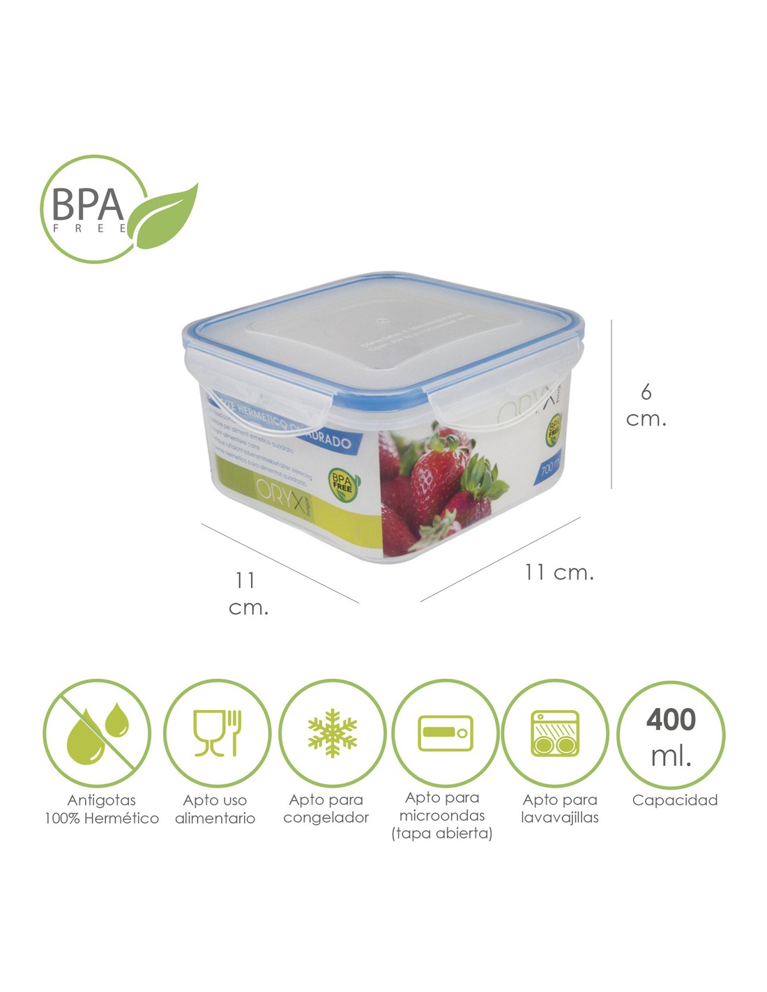 - Apto para congelador, frigorífico, lavavajillas, microondas (siempre que no esté cerrado, las tapas deben quedar apoyadas en el recipiente permitiendo la circulación de aire dentro del mismo. Recipientes no aptos para horno ni grill, cuando se limpie en el lavavajillas recomendamos ponerlo en la parte superior)