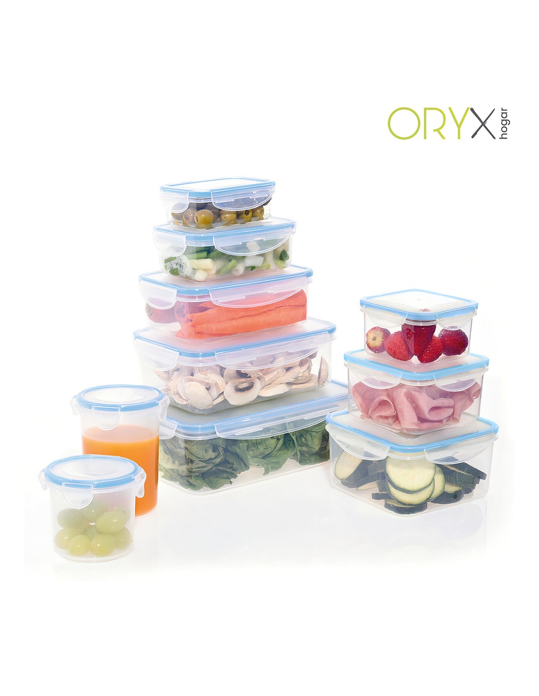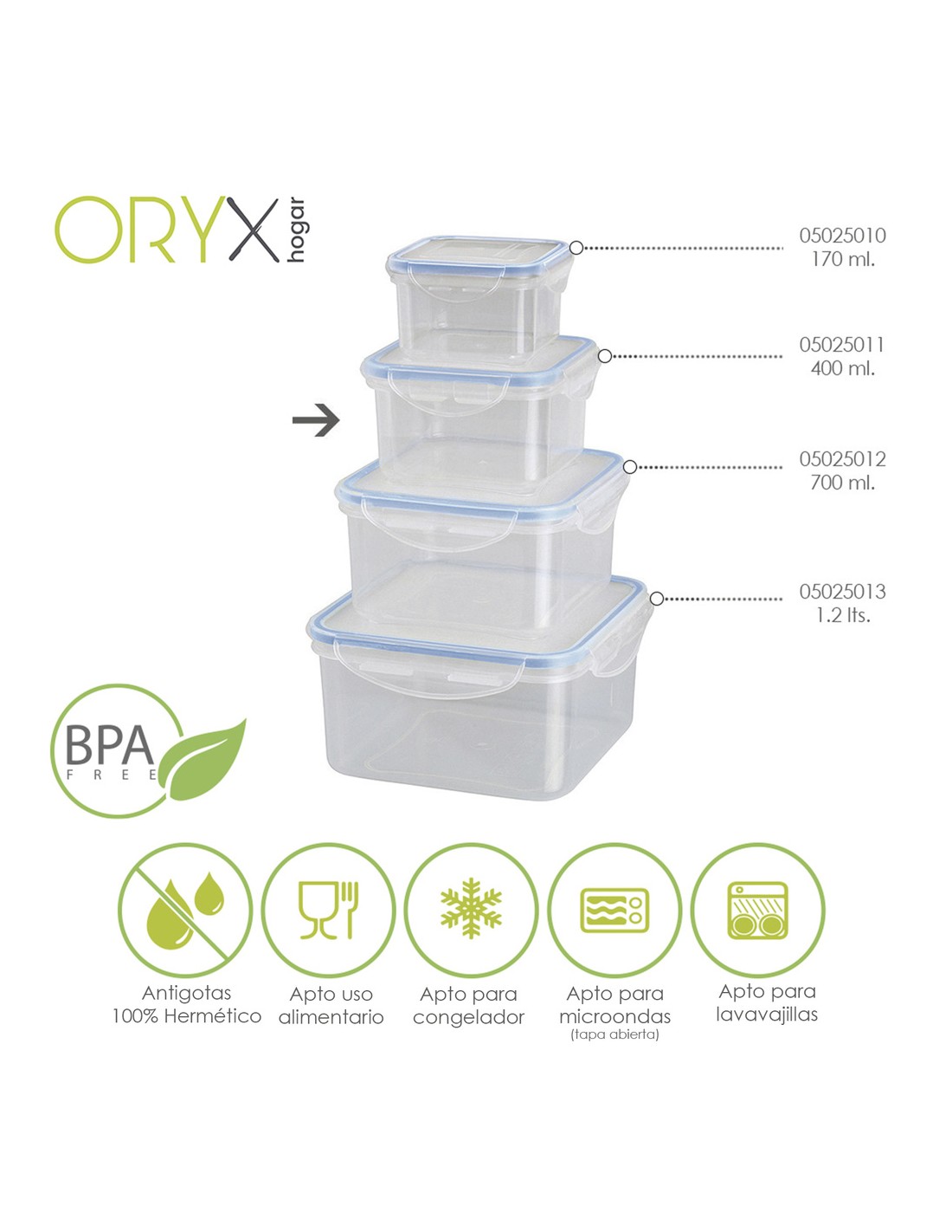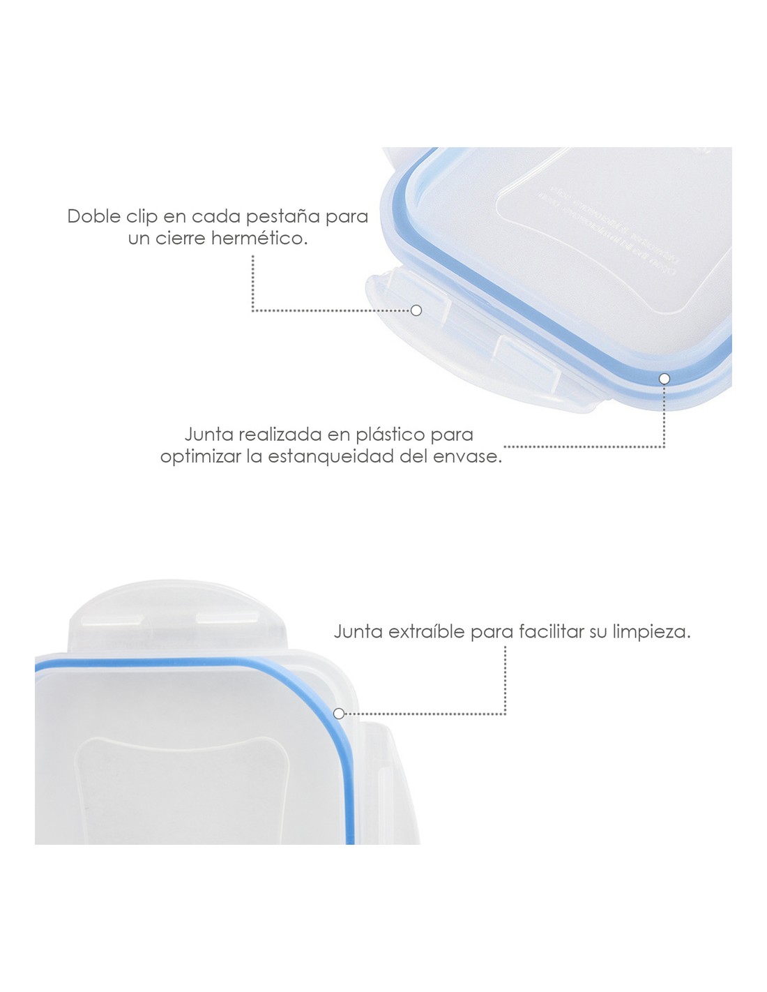 - Recipientes herméticos para una mejor conservación y un transporte sin derrames. Las tapas cuentan con un sistema de 4 cierres de bloqueo además están realizadas en silicona inyectada que se adhiere al recipiente aislando los alimentos de gérmenes y olores externos y favoreciendo su perfecta conservación.