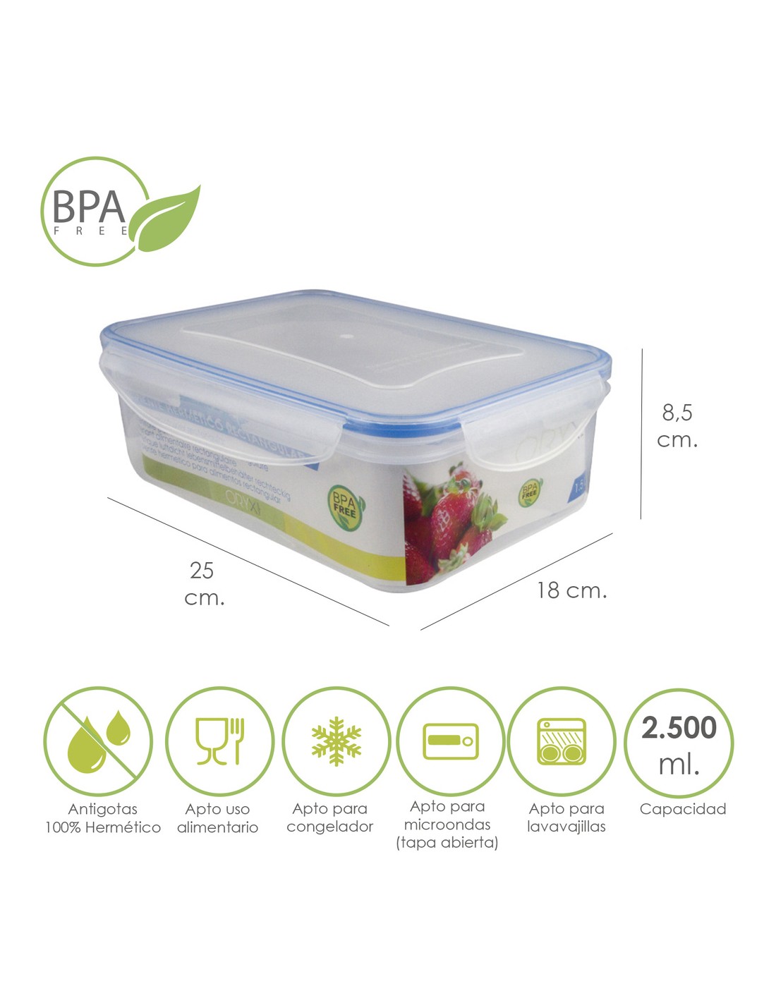Recipiente Hermetico Plastico Rectangular 2.500 ml. 25x18x8.5 (Alt.) cm.