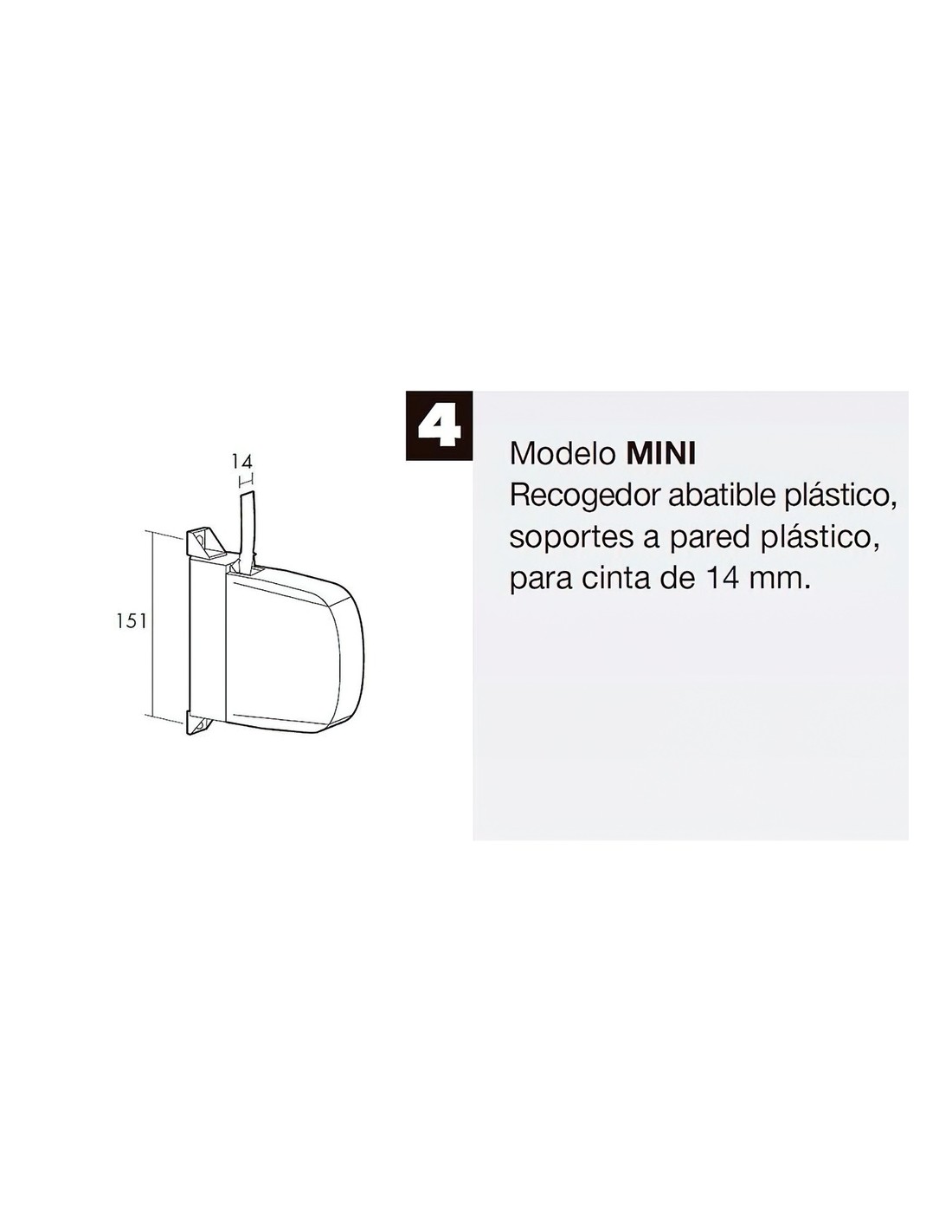 Recogedor persiana mini 6 metros. - Ancho de la cinta 14 mm. - Recogedor abatible abatible. - Incluye 5,5 metros de cinta color gris. - Color blanco. - Distancia entre tornillos: 151 mm.