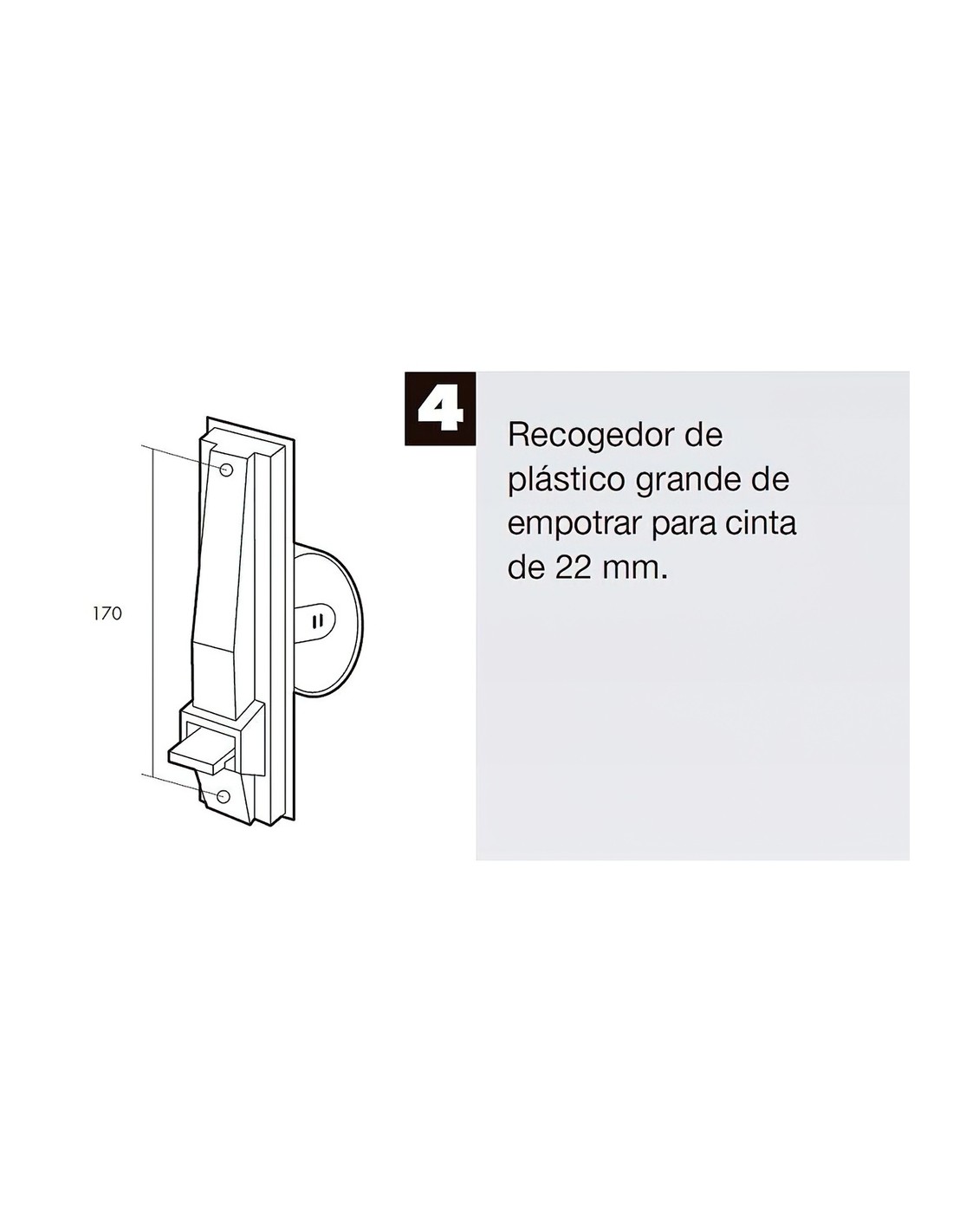 Recogedor persiana plastico grande blanco - Apto para cintas de 18 mm. hasta 22 mm. - Placa de 20x 6 cm. - Para empotrar. - Interior realizado en metal. - Distancia entre tornillos: 170 mm.