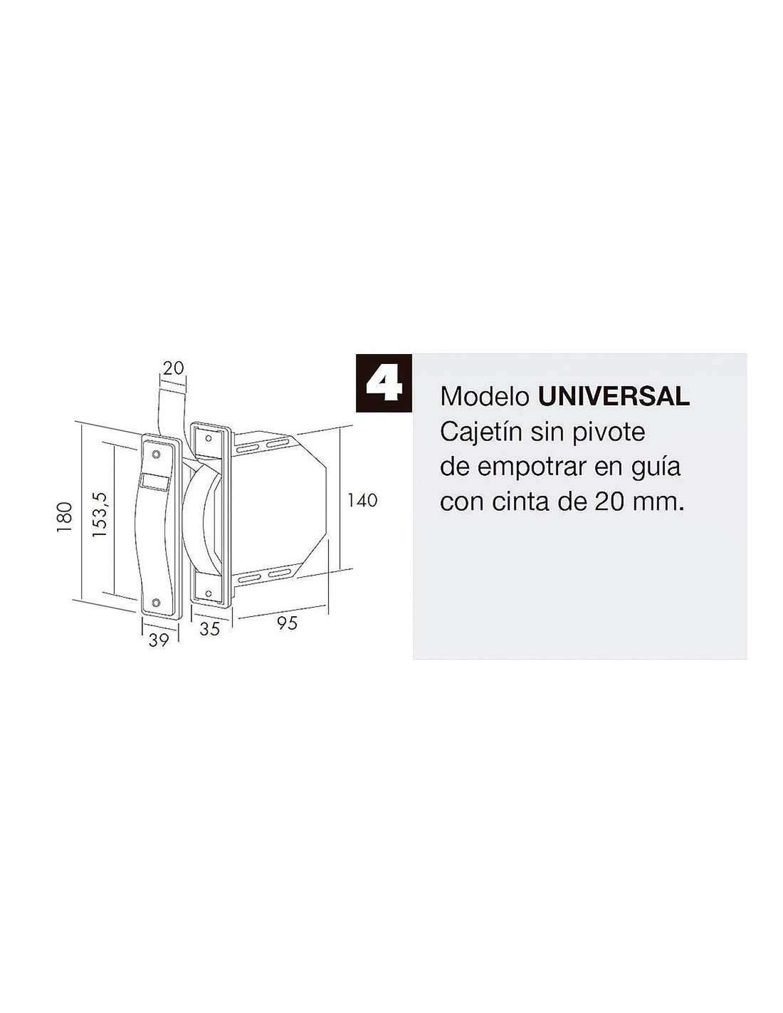 Recogedor persiana - Tamaño frontal 180 mm. - Cajetin sin pivote. - De empotrar en guia. - Universal, valido para cintas de hasta 20 mm. - Color blanco. - Incluye cinta de 5,5 metros. - Color pintas. - Distancia entre tornillos 153,5 mm.