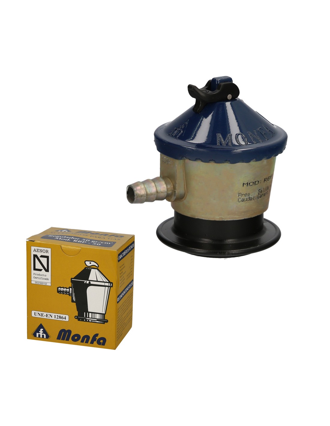 Regulador Gas Butano Monfa (50 Grms./cm2) Alcachofa Gas, Regulador Gas Butano. Presión 50 mbar. Caudal 2,5 Kg/hora