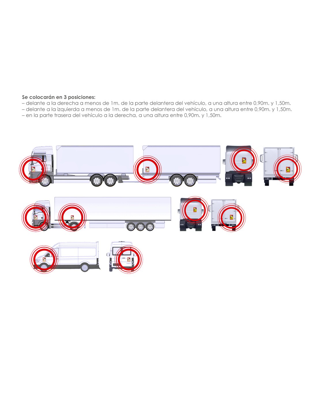 - A partir del 1 enero 2021, todos los vehículos pesados (más de 3500 Kg. de MMA tractoras, rígidos, buses, furgonetas, remolque y semirremolques) que vayan a circular por Francia, están obligados a estar equipados con pegatinas que muestren la posición de los puntos ciegos / ángulo muerto.