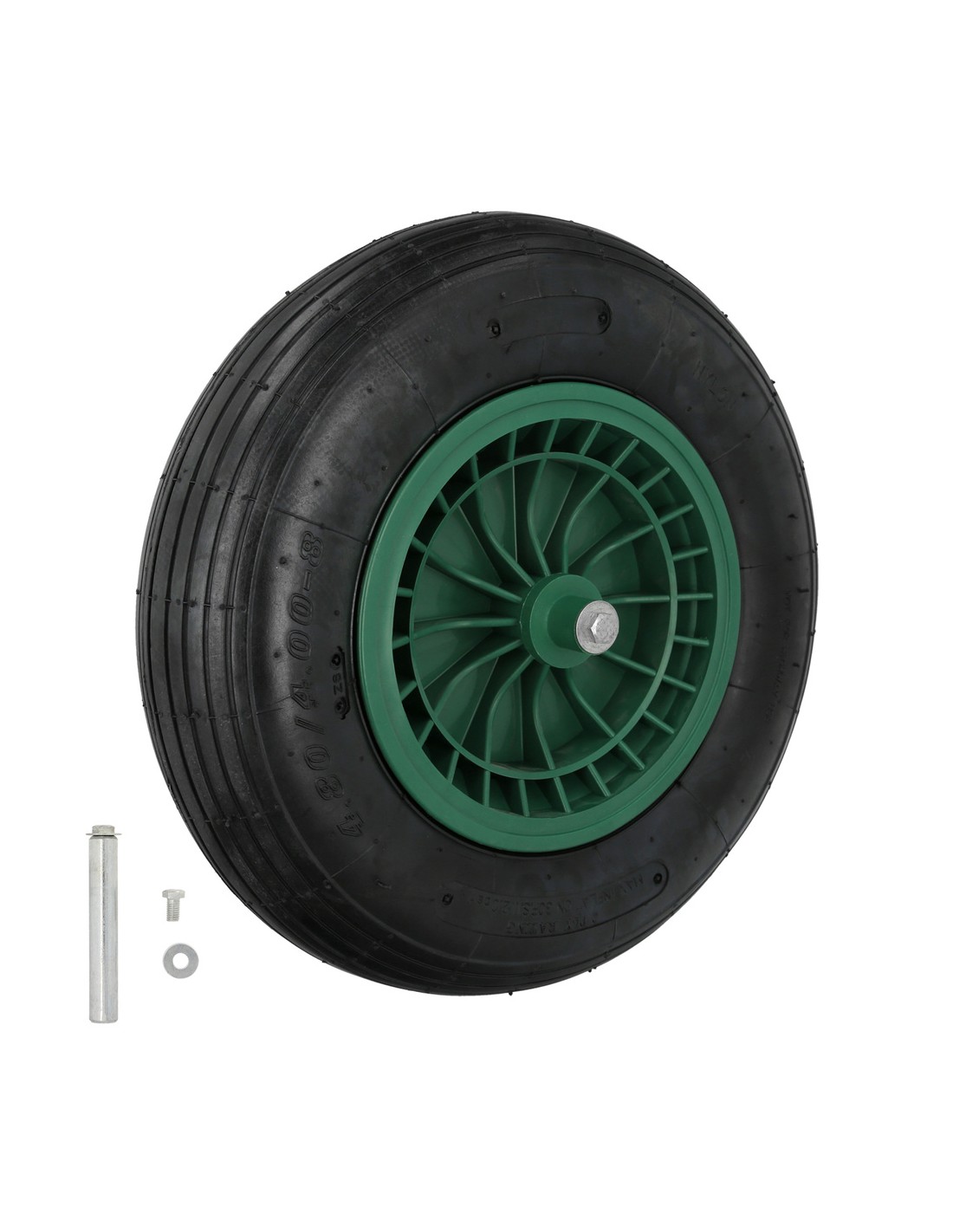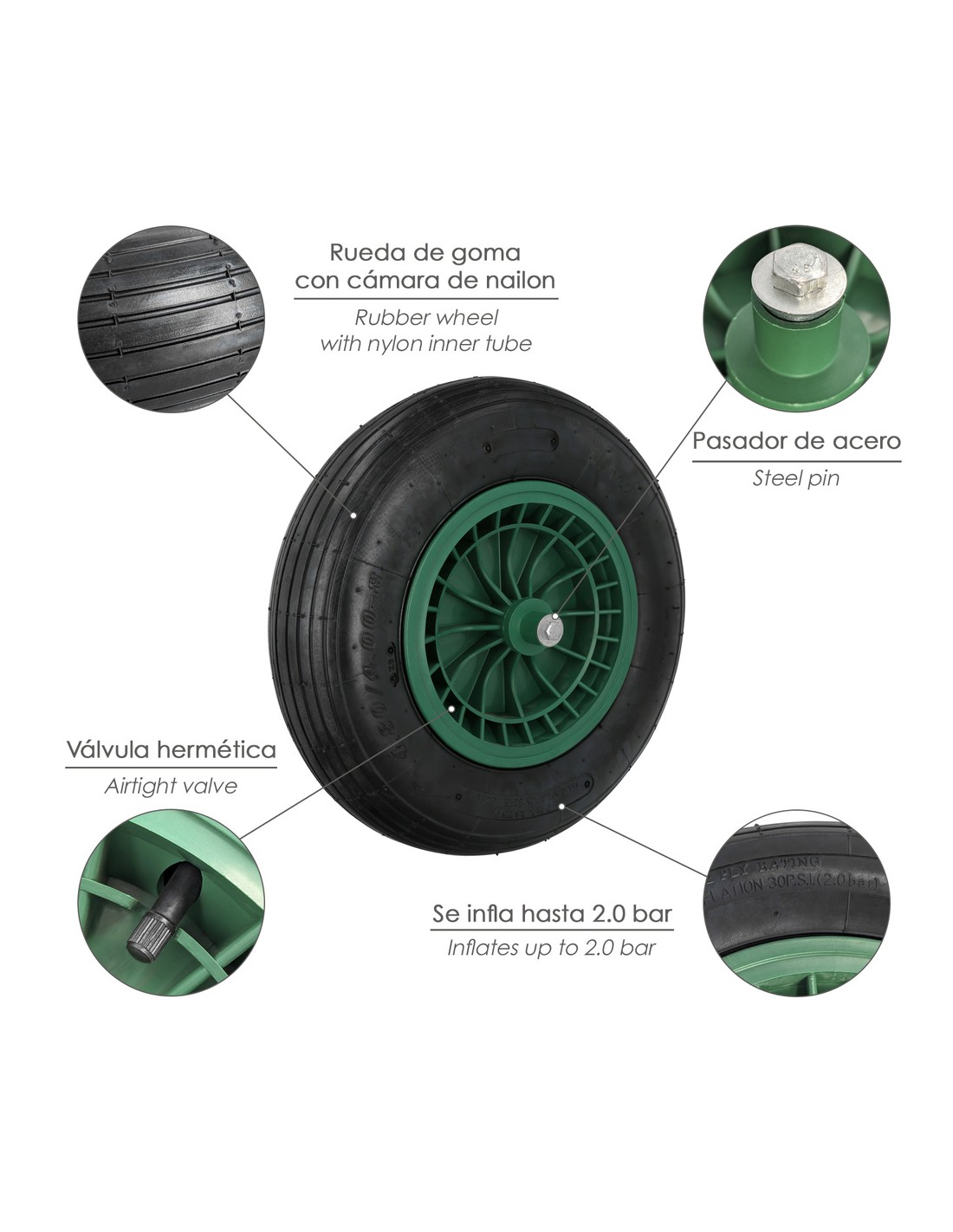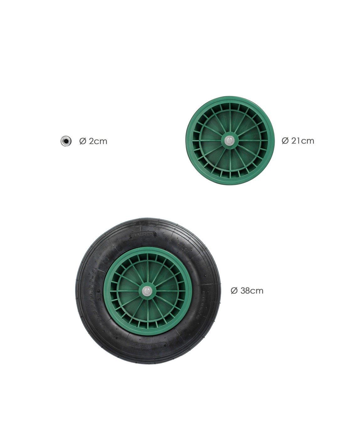 - Con un diámetro de 38 cm, esta rueda está diseñada para proporcionar estabilidad y rendimiento óptimo en carretillas de obra y jardín.