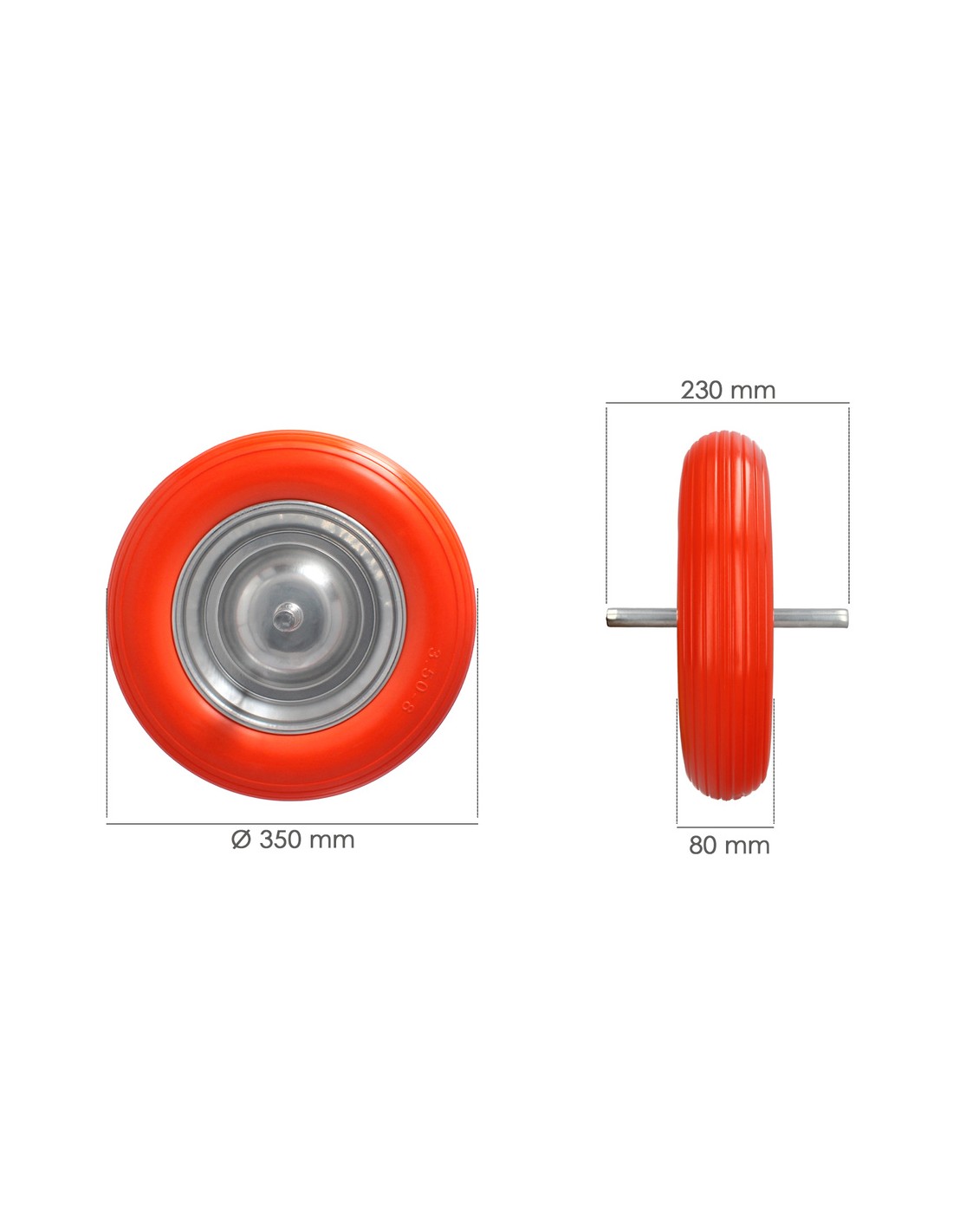 - Dimensiones: Diámetro de la rueda 350 mm, Ancho de la rueda 80 mm, Diametro de la llanta 220 mm, Diámetro del eje 19 mm y Longitud del eje 230 mm.