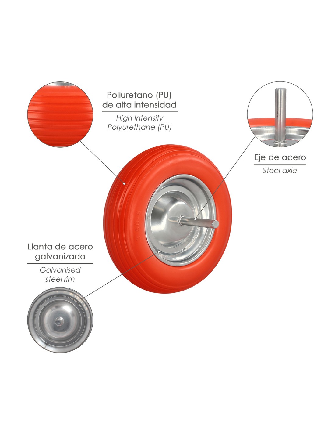 - La llanta y los ejes están elaborados en acero galvanizado, lo que garantiza una durabilidad excepcional y una resistencia superior.