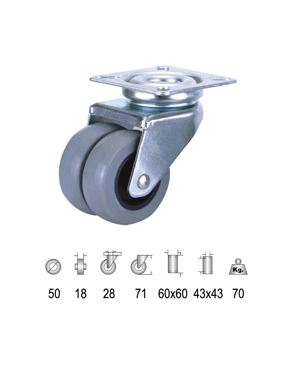 Rueda Doméstica Doble Poliamida Gris Placa 50mm - Ø: 50 mm. Ancho: 18 mm. - Capacidad: 70 Kgs. Dim. Placa: 60x60 mm. - Dimenensiones orificio placa: 13x6,3 mm. - Distancia entre orificios: 43x43 mm. - Altura de la rueda: 71 mm.