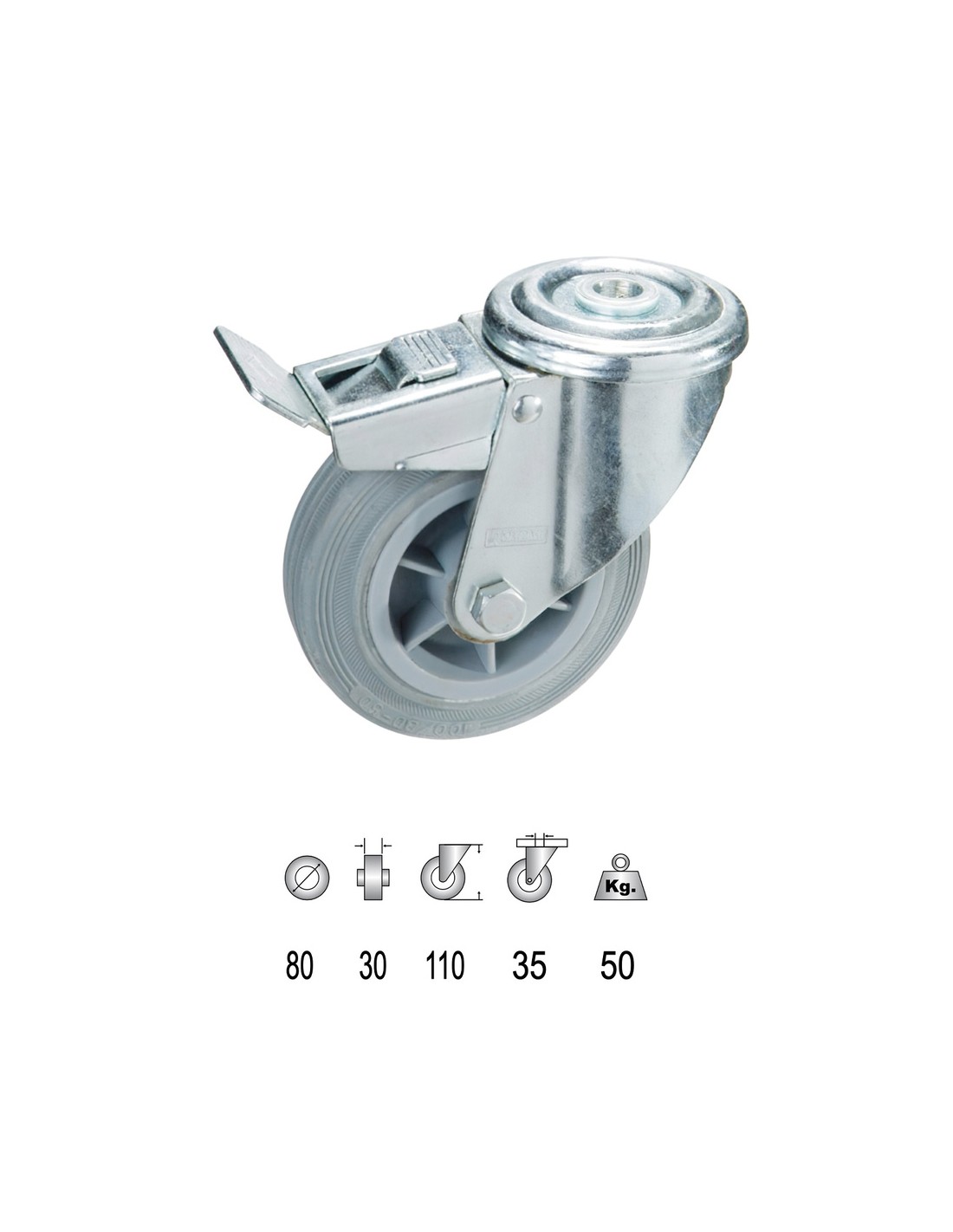 Rueda Industrial Goma Gris Pasante con freno 80mm - Ø: 80 mm. - Ancho: 30 mm. - Capacidad: 50 Kgs. - Ø para espiga: 35 mm. - Altura de la rueda: 110 mm.