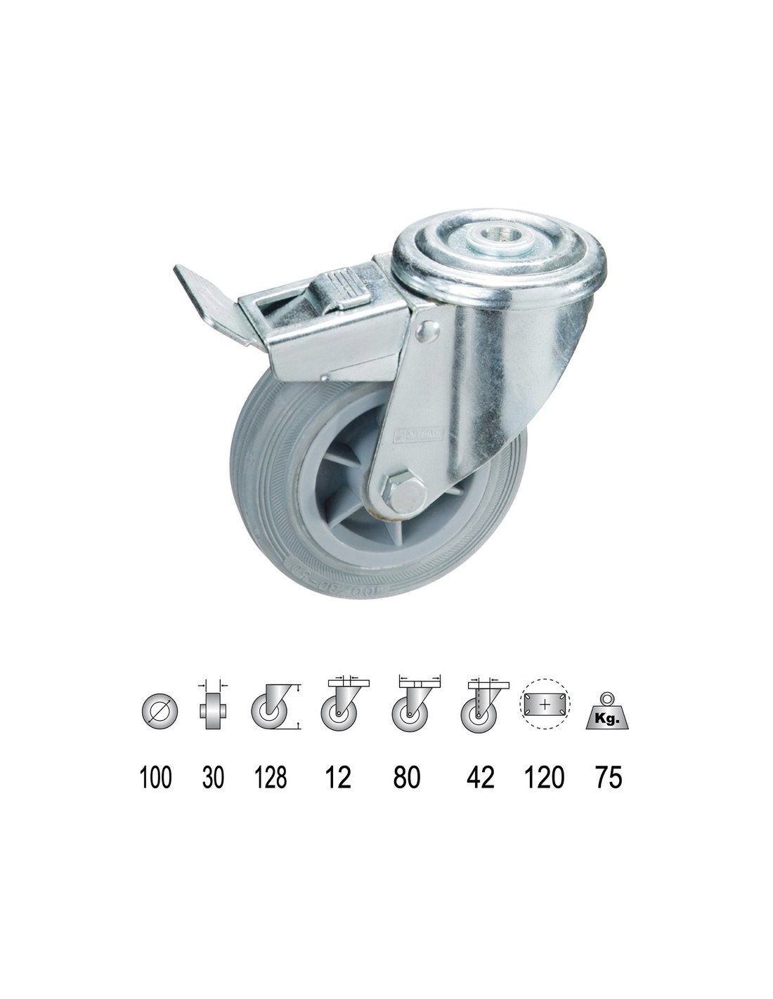 Rueda de goma gris, soporte industrial con freno. - Diámetro: 100 mm. - Ancho rueda: 30 mm. - Diámetro agujero pasante: 12 mm. - Capacidad máxima de carga: 75 Kg. - Realizada en goma.