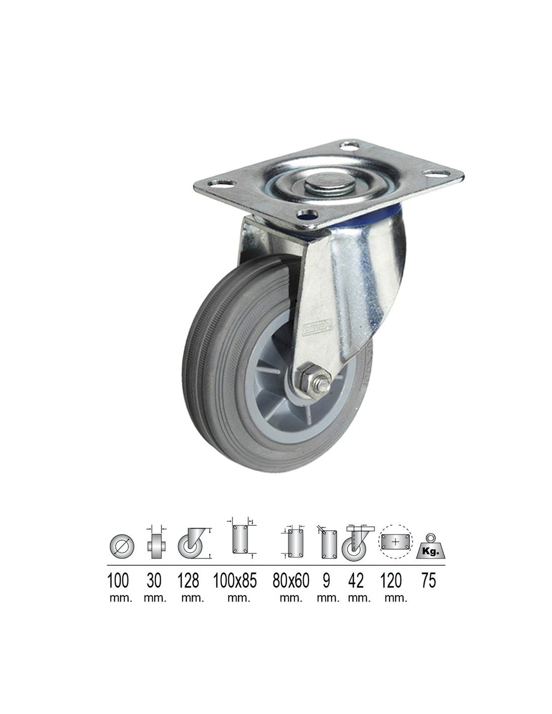 Rueda de goma gris, soporte industrial. - Diámetro: 100 mm. - Ancho rueda: 30 mm. - Tamaño soporte: 100x85 mm. - Carga máxima soportada: 75 Kg. - Realizada en goma. - Rueda con pletina: 130 mm.