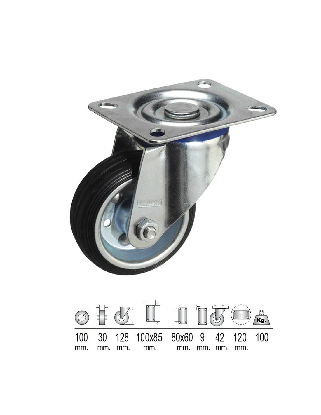 Rueda de goma negra, soporte industrial. - Diámetro: 100 mm. - Ancho rueda: 30 mm. - Tamaño pletina: 100x85 mm. - Carga máxima soportada: 100 Kg. - Realizada en goma. - Rueda con pletina: 130 mm.