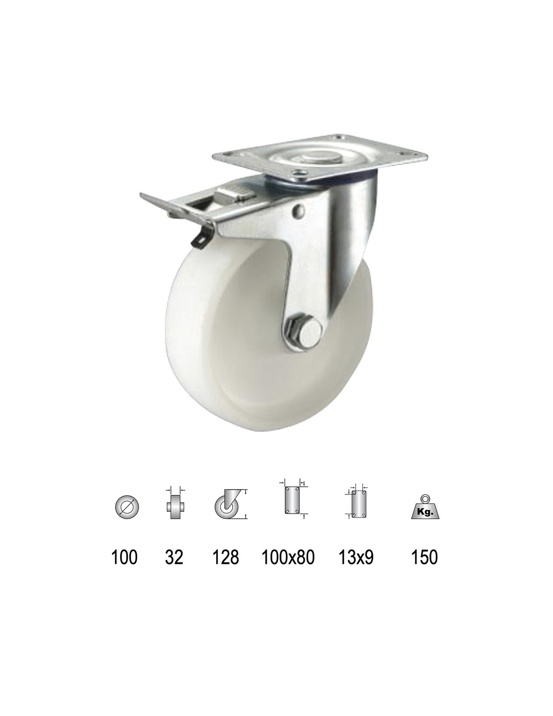 Rueda Industrial Nylon Placa con freno 100mm Ø: 100 mm. Ancho: 32 mm. Capacidad: 150 Kgs. - Dimensiones Placa: 100x80 mm. - Dimensiones orificio placa: 13x9 mm. - Distancia entre orificios: 80x60 mm. - Altura de la rueda: 128 mm.
