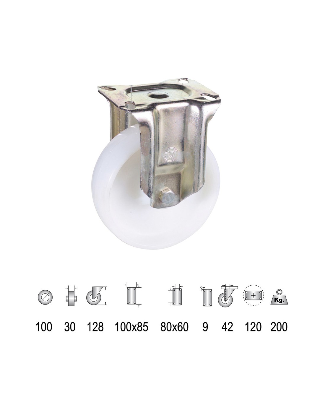 Rueda mono-bloque de poliamida, soporte industrial. - Diámetro: 100 mm. - Ancho rueda: 30 mm. - Tamaño pletina: 100x85 mm. - Carga máxima soportada: 200 Kg. - Realizada en nylon.