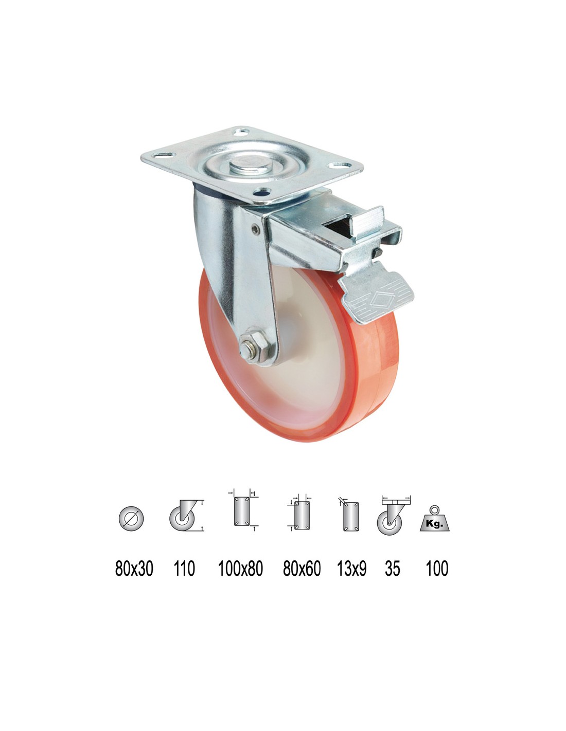 Rueda industrial poliuretano con pletina y freno. - Diámetro: 80 mm. - Ancho rueda: 30 mm. - Tamaño pletina: 100x80 mm. - Carga máxima soportada: 100 Kg. - Realizada en poliuretano.