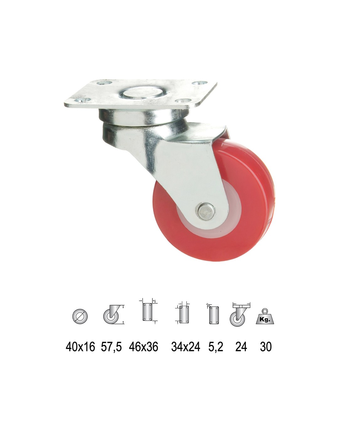 Rueda poliuretano con pletina. - Diámetro: 40 mm. - Ancho rueda: 16 mm. - Tamaño pletina: 46x36 mm. - Carga máxima soportada: 30 Kg. - Realizada en poliuretano.