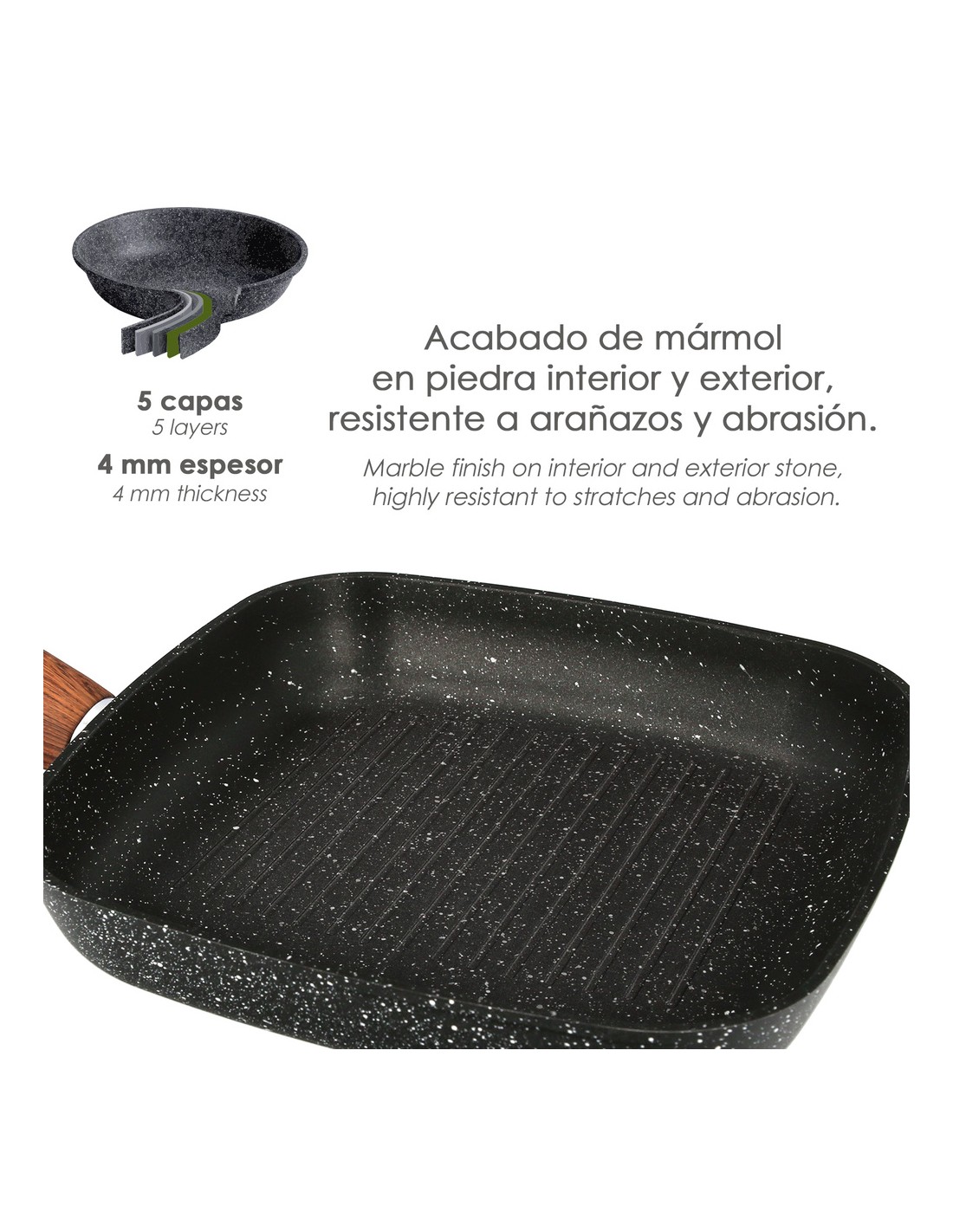 - Cuenta con 5 capas y un espesor de 4 mm. permitiendo que el calor se distribuya de forma rápida y homogéneamente.