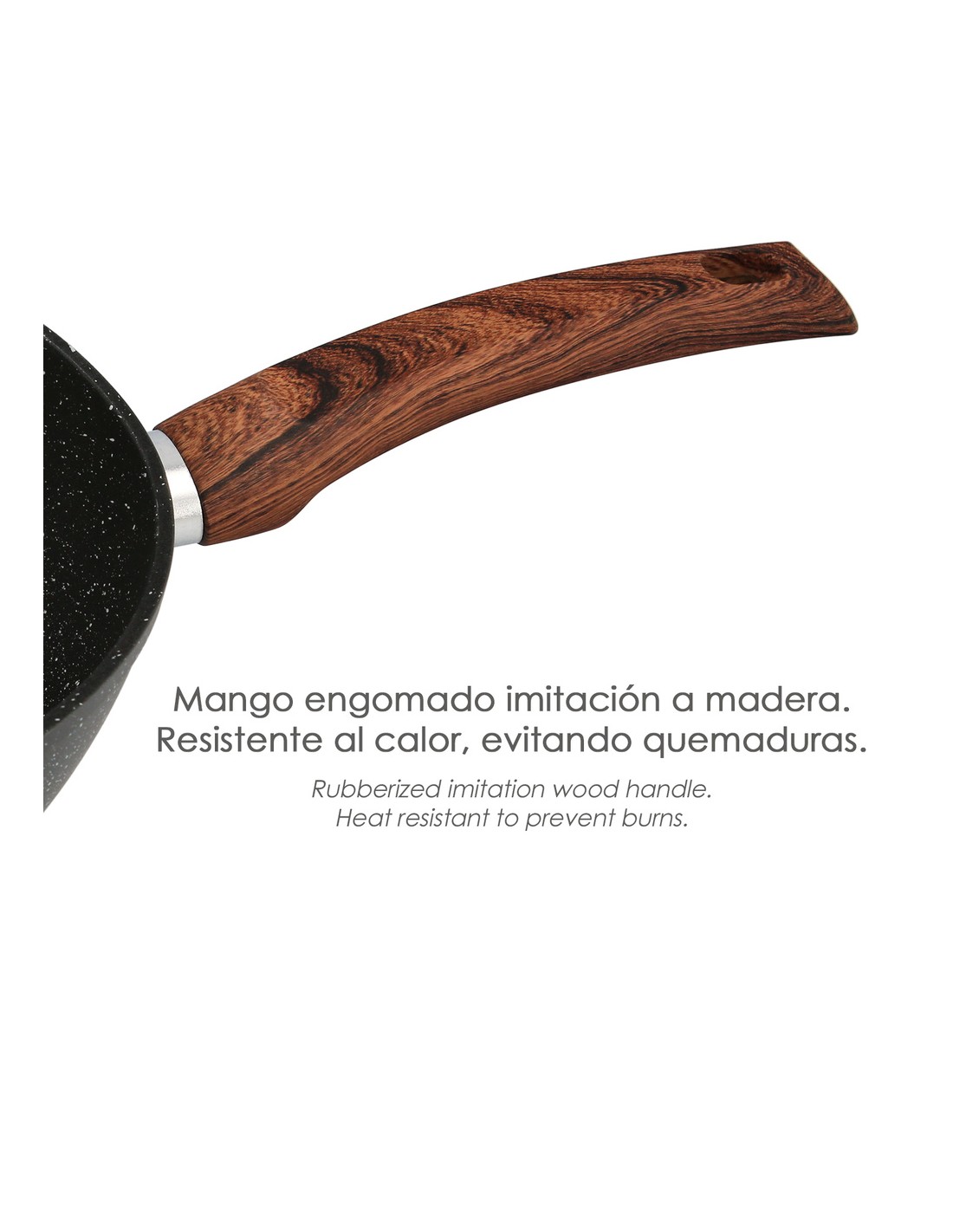 - Mango engomado imitación a madera. Resistente al calor. Se mantiene frío al tacto para evitar quemaduras.