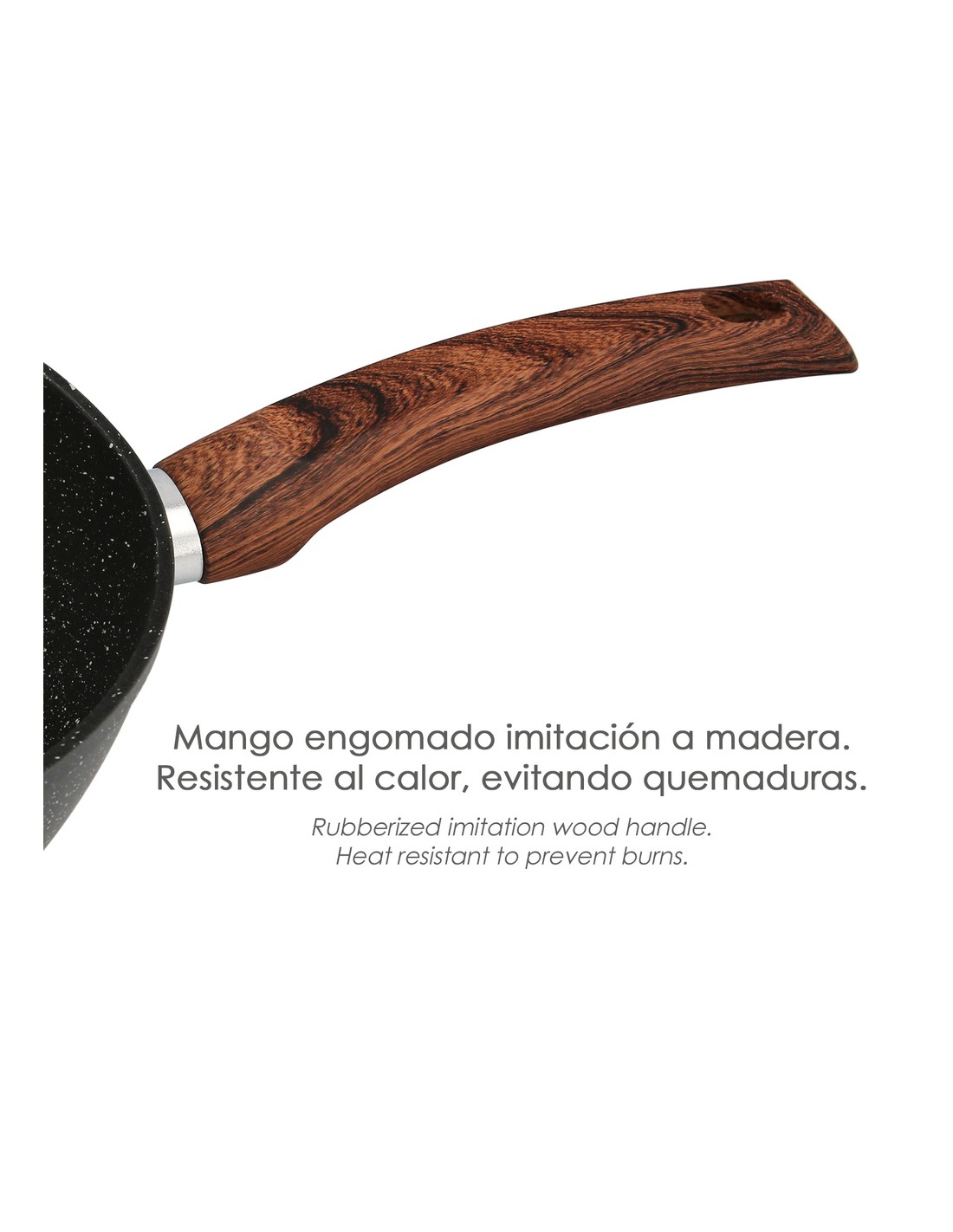 - Mango engomado imitación a madera. Resistente al calor. Se mantiene frío al tacto para evitar quemaduras.