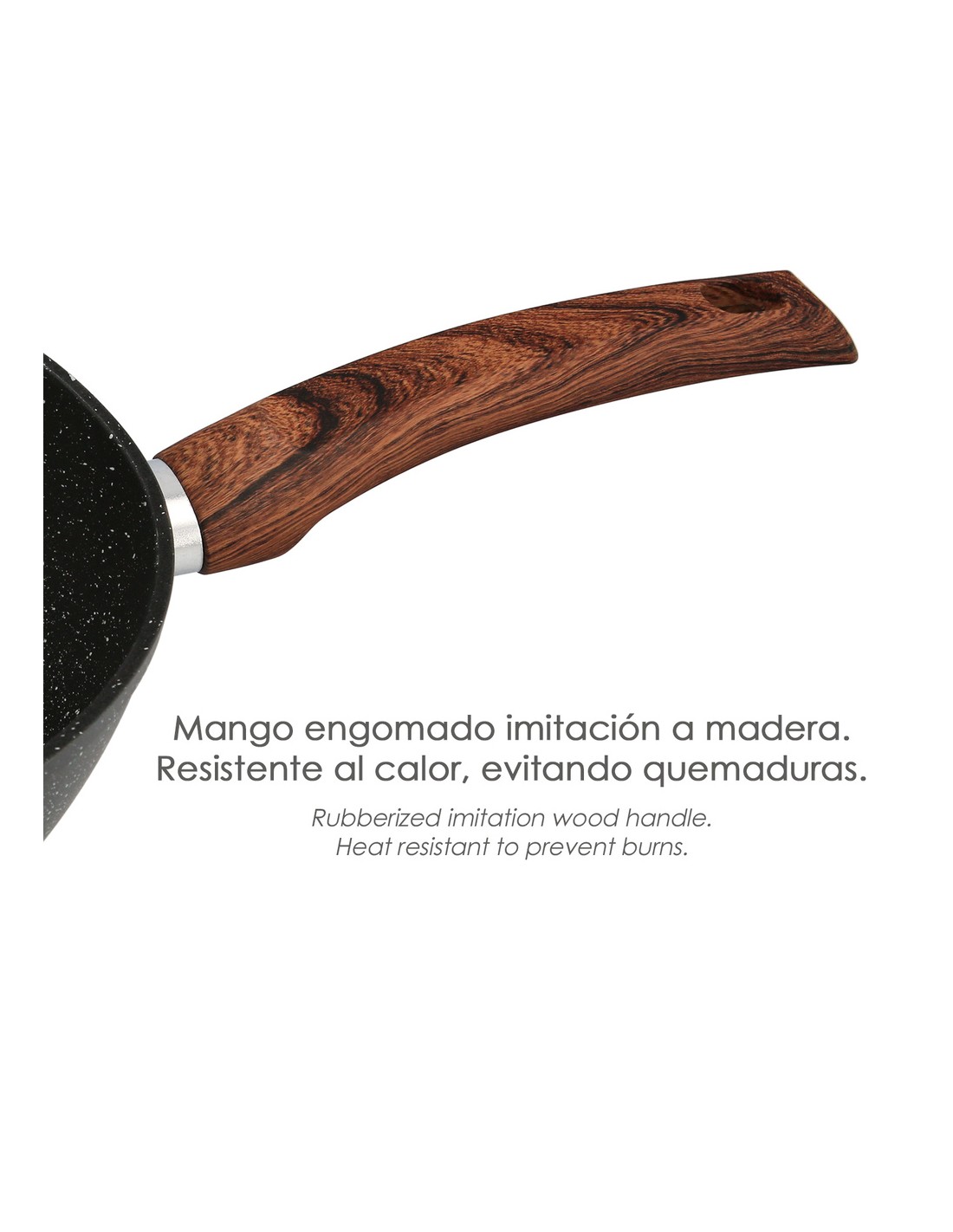 - Mango engomado imitación a madera. Resistente al calor. Se mantiene frío al tacto para evitar quemaduras.