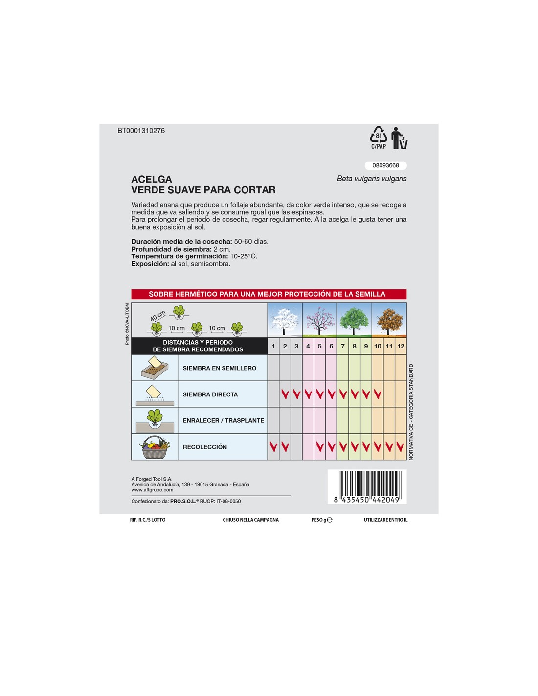 - Temperatura de germinación: 10-25°C.