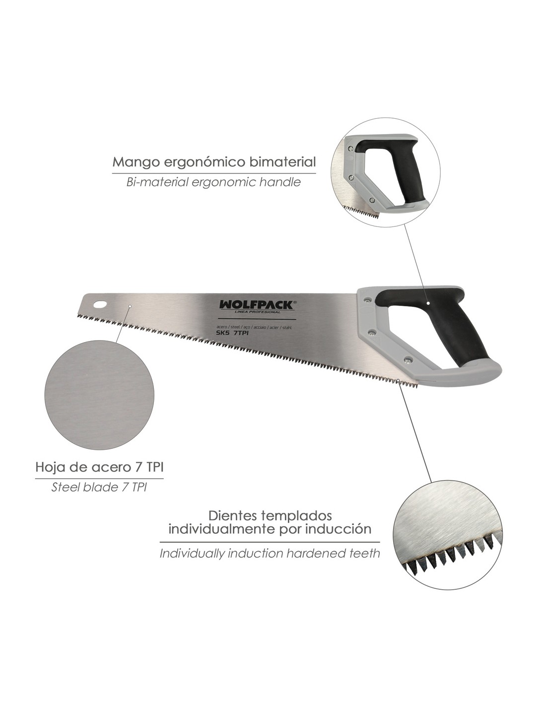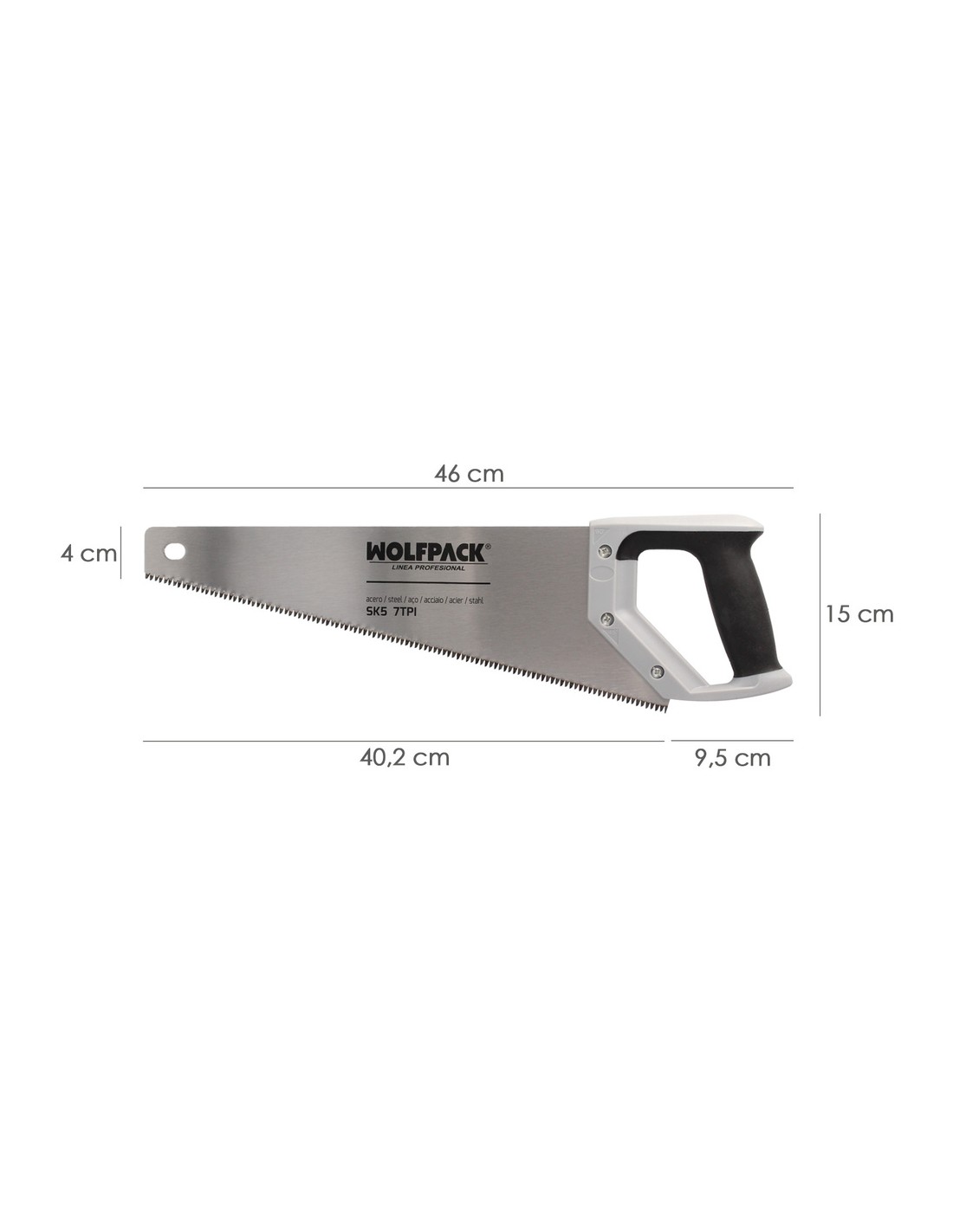 - Dientes del serrucho templados con triple afilado, cuenta con una separación de 7TPI, especialmente diseñado para maderas blandas, contrachapados, suelos, laminados, tuberías de plástico PVC/ABS, etc.