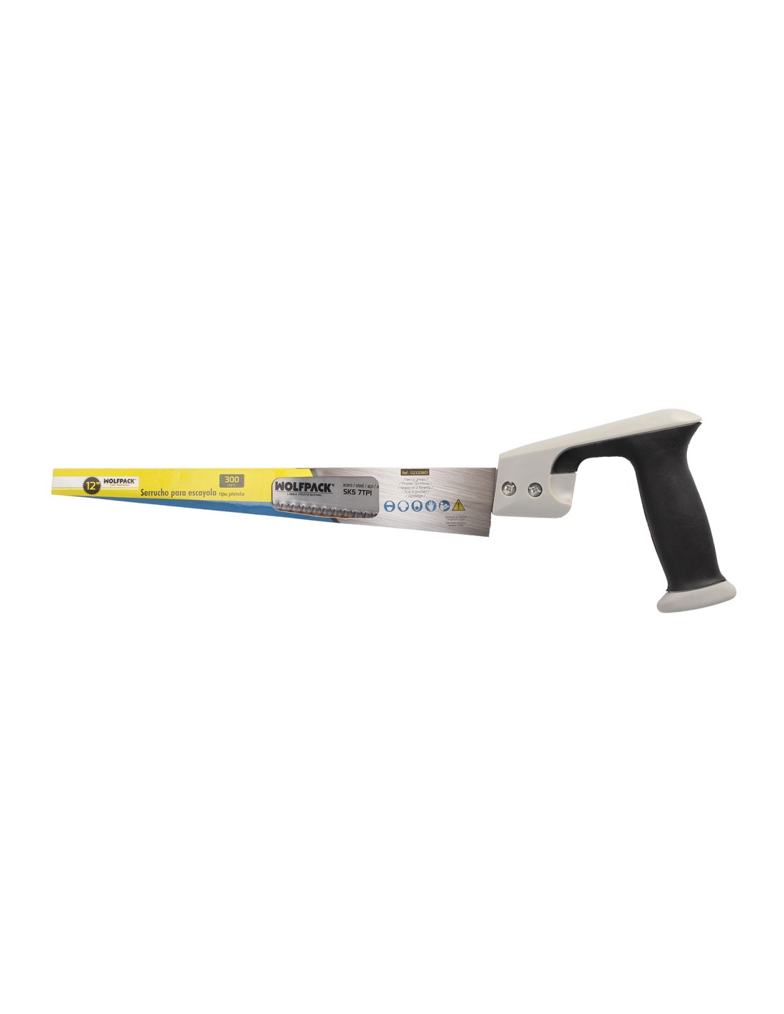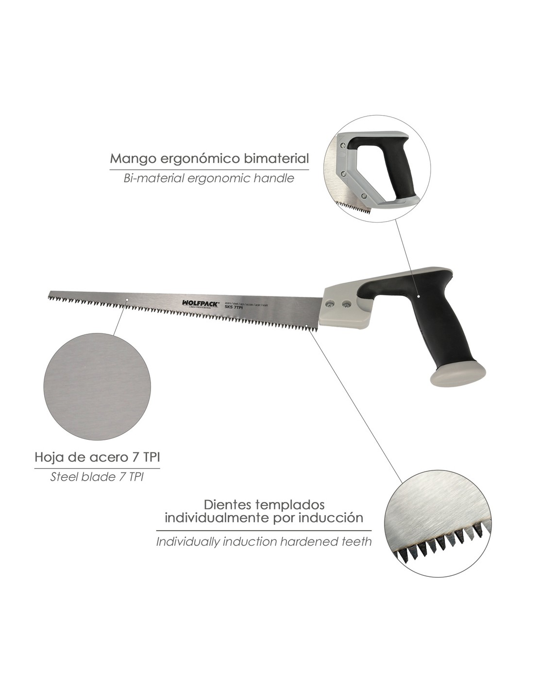 - Dientes del serrucho templados con triple afilado, cuenta con una separación de 7 TPI, especialmente diseñado para maderas pladur, yeso y escayola.