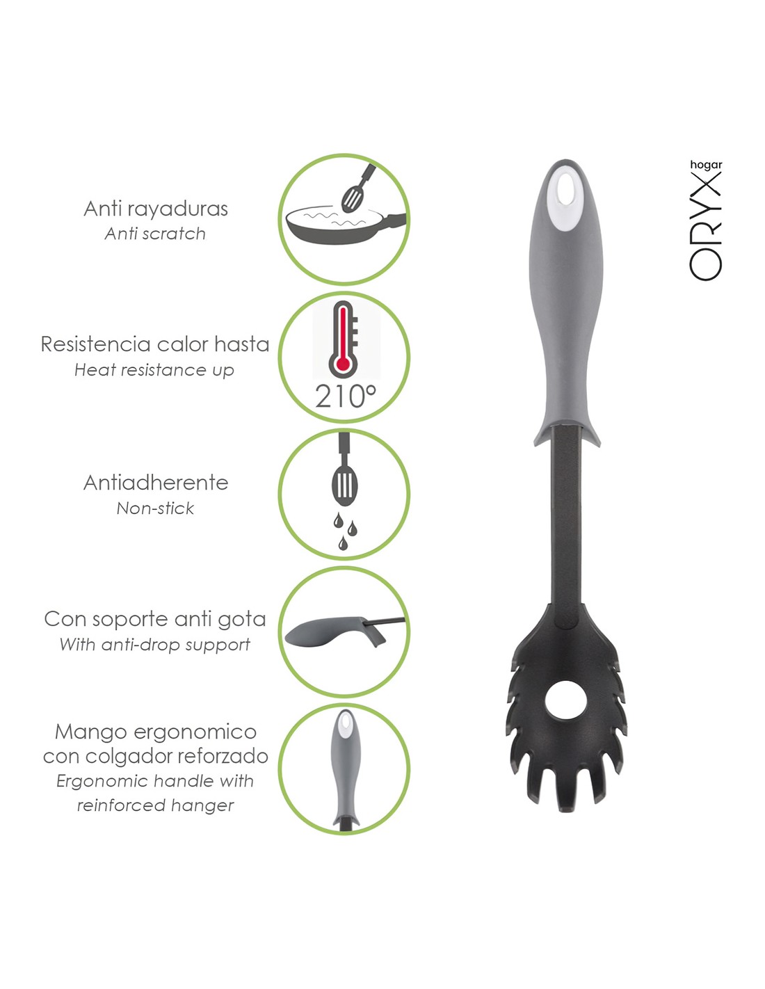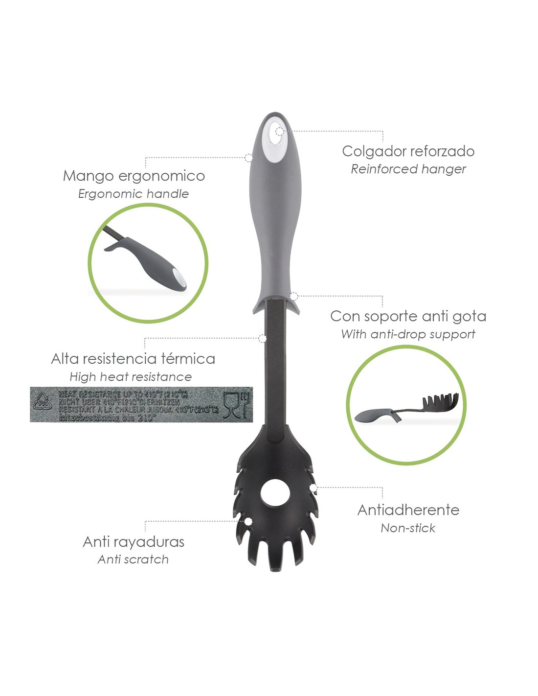 - Realizado en nylon, material ligero y resistente. Material similar a la silicona, ya que ambos materiales no absorven olores ni sabores ademas pueden usarse en todo tipo de sartenes y ollas, ya uqe no rayan la base.