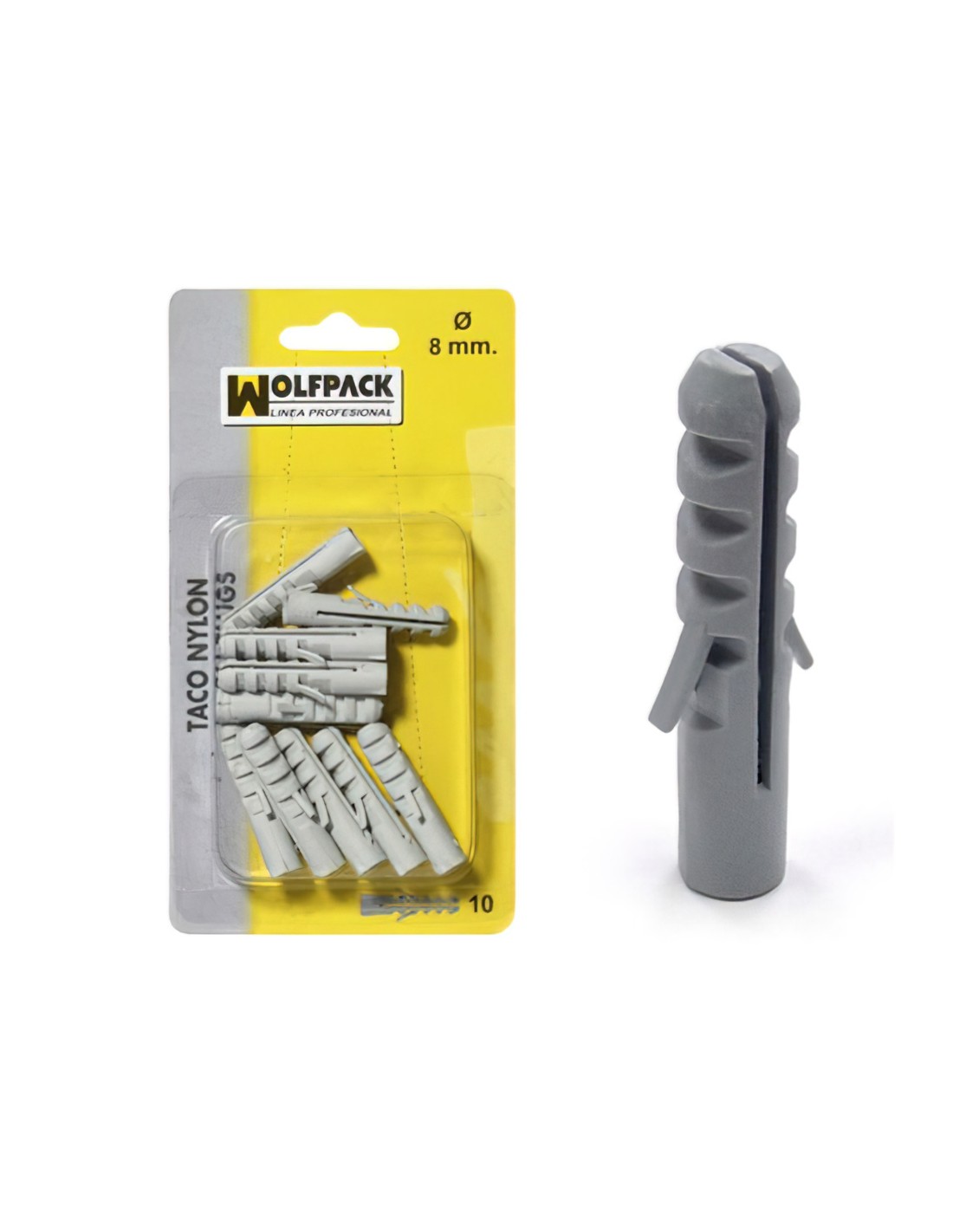 Tacos Nylon 8 mm. (10 Piezas). - Diámetro: 8 mm. - Blister de 10 piezas. - El manguito de conector sin reborde permite que el conector se coloque tan profundo como sea necesario. - La expansión sólo tiene lugar cuando se hace girar el tornillo.