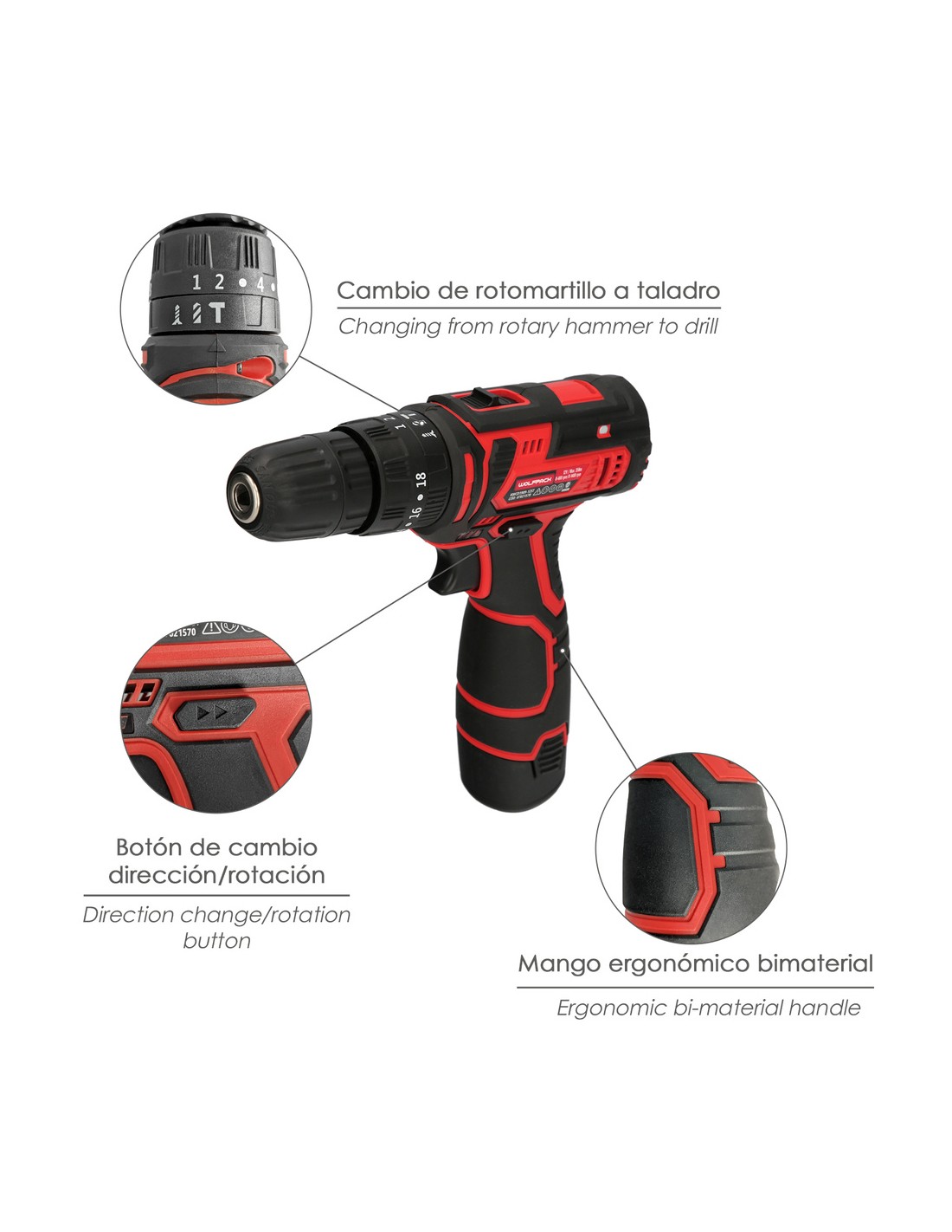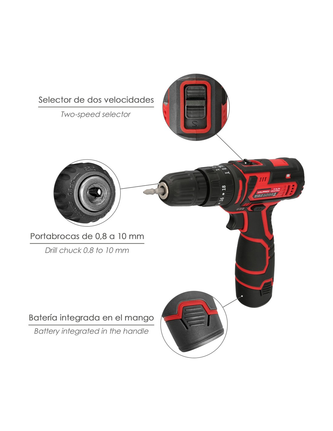 - Capacidad del portabrocas: Ø 0,8 a Ø 10 mm.