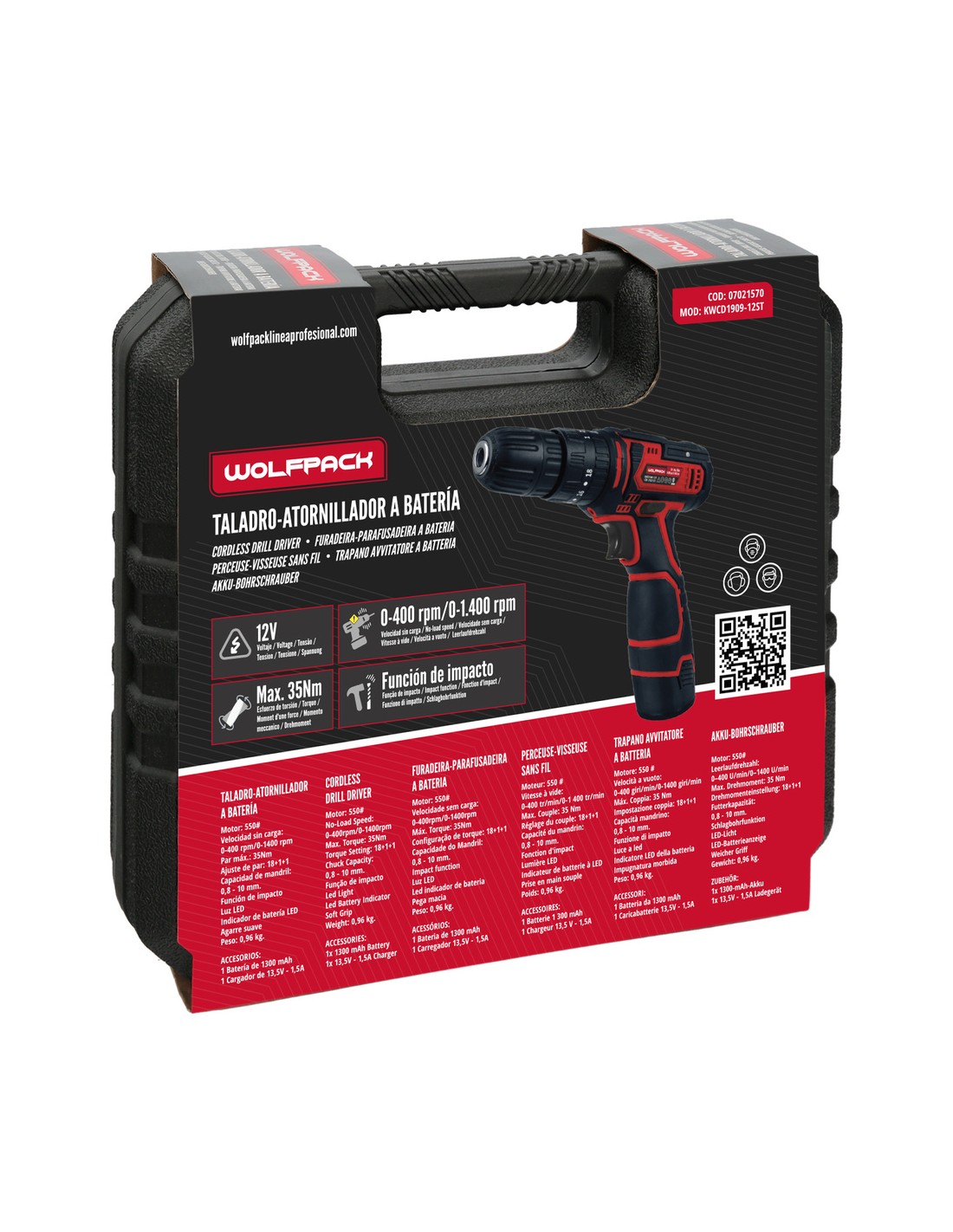 Taladro Atornillador 12 V. Con 2 Velocidades y Percutor. Bateria 1.300 mAh. Par Apriete 35 Nm.