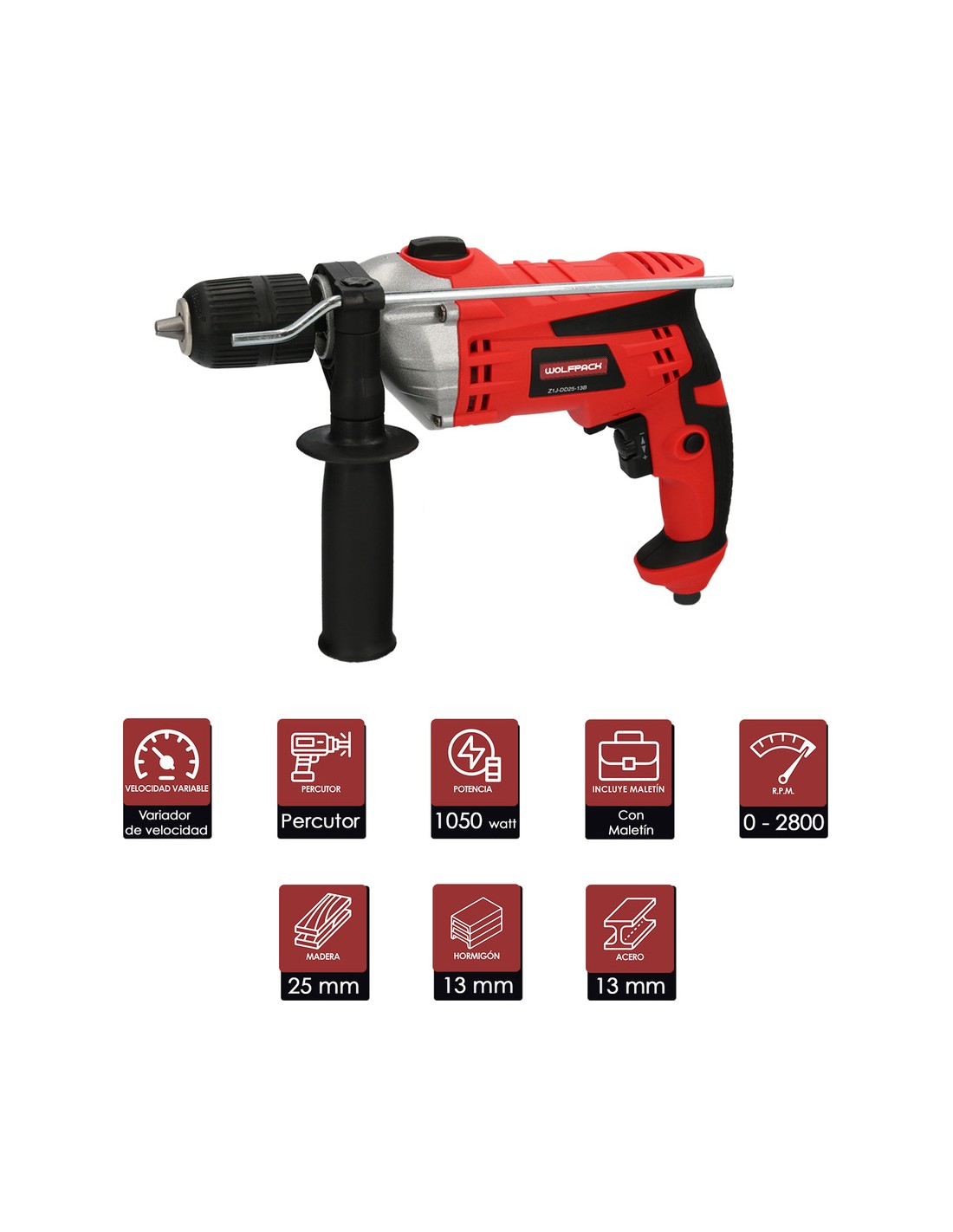 Taladro Percutor Con Variador de Velocidad 1050 Watt. Incluye Maletín, Empuñadura y Guia Metalica.