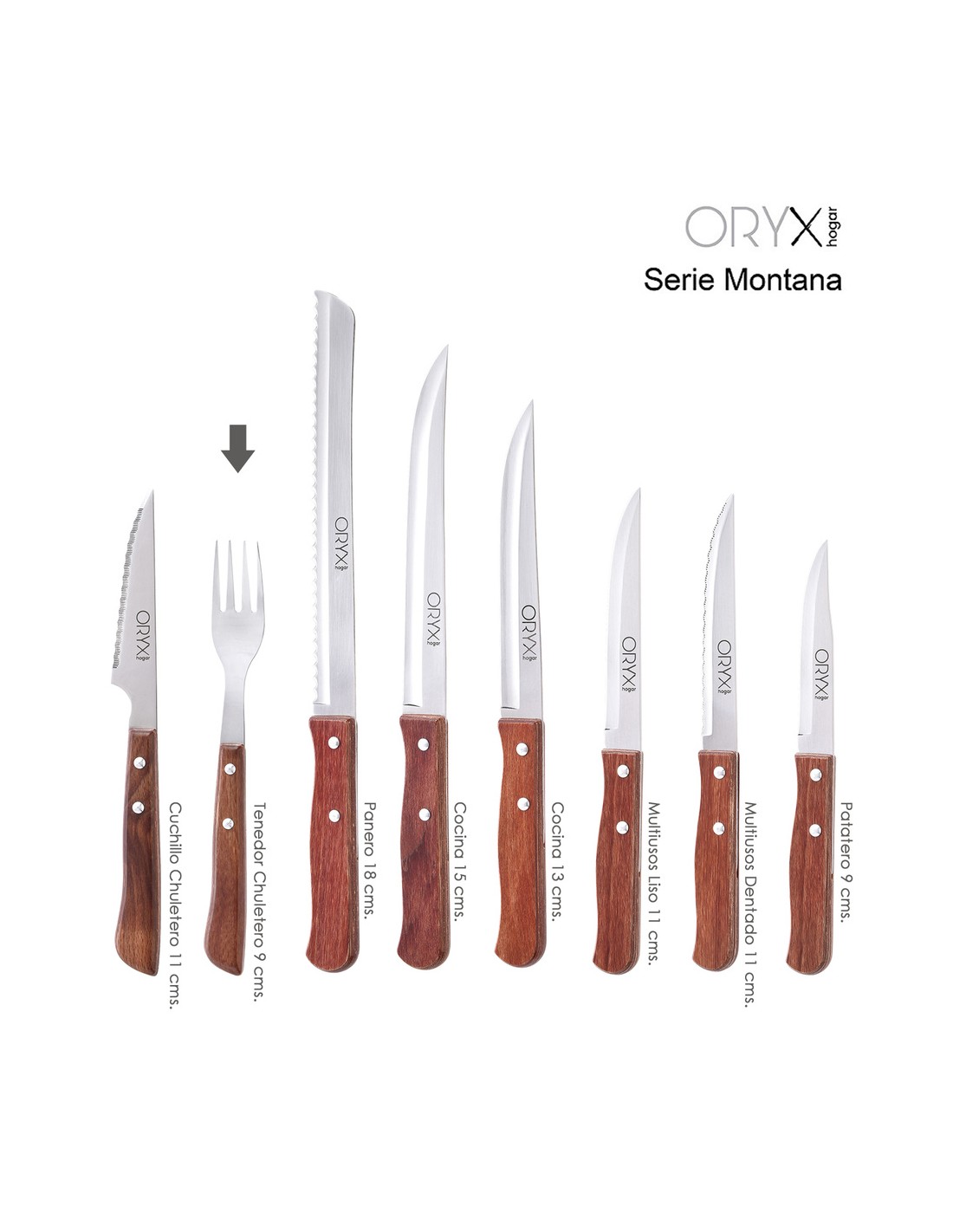 - La serie Montana se define por su parecido con maderas naturales, fabricados en acero inoxidable, de hoja estrecha y mango de madera prensada, se trata de un diseño clasico, funcional y resistente, caracteristicas que hacen que su duración sea larga, incluso con usos frecuentes.