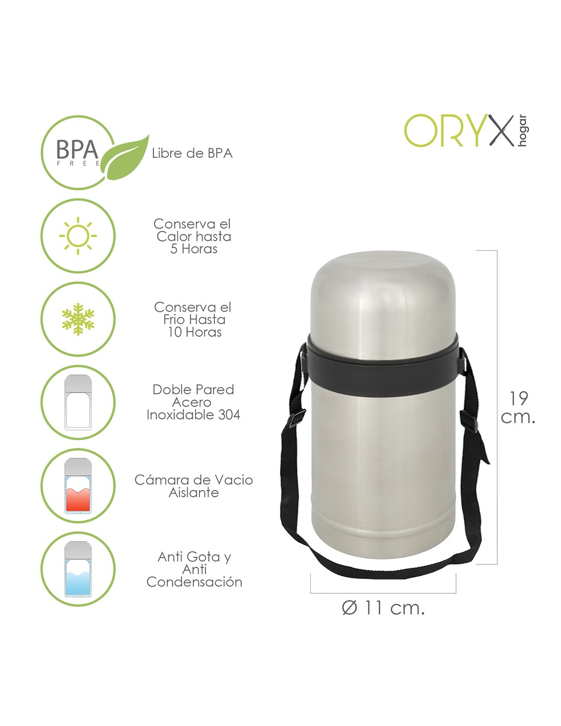 - Mantiene durante horas tus bebidas frías o calientes. Se recomienda atemperar el interior con agua fría o caliente justo previo al uso para mayor prolongación de la temperatura interior.