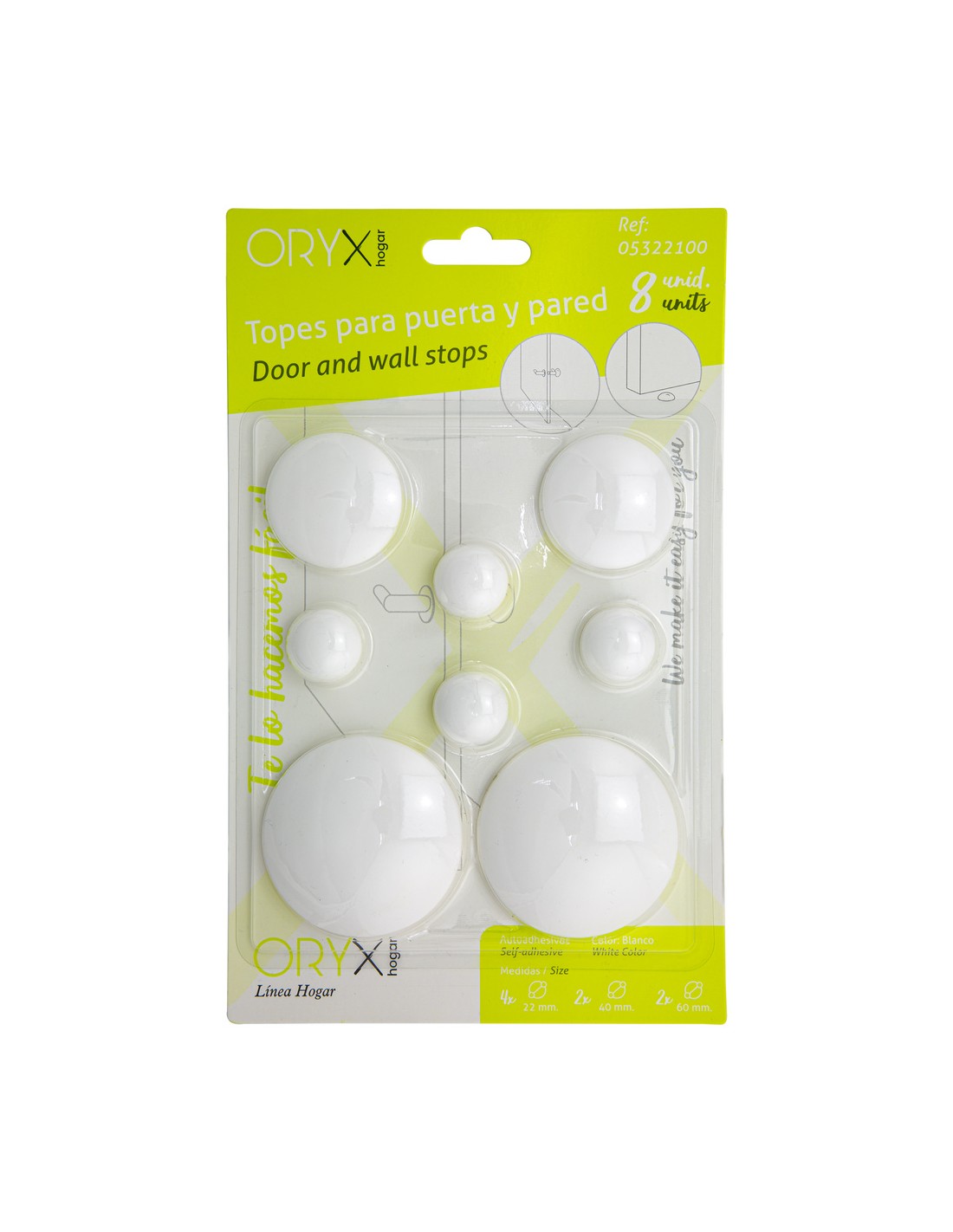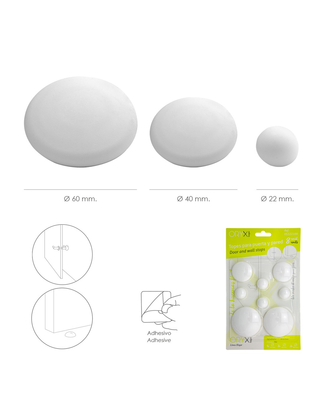 Topes Adhesivos para Paredes / Puertas / Ventanas / Mobiliario 2 x Ø 60 mm. / 2 x 40 mm. / 4 x 22 mm. (Blister 8 piezas)