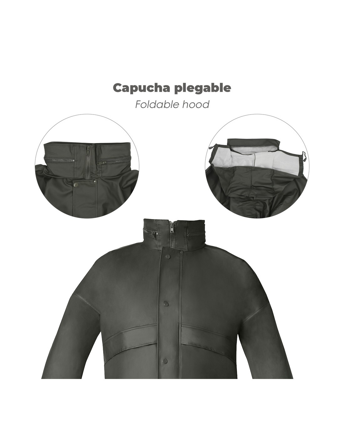 - Capucha dentro del cuello con cierre de cremallera, con cordones de ajuste.