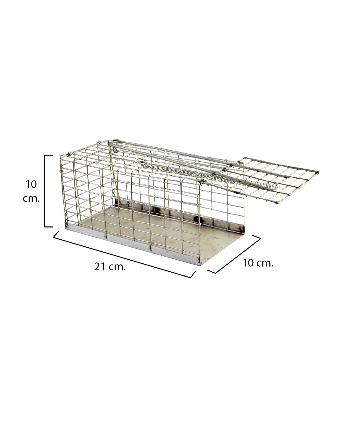 Trampa Ratas Jaula Metal. - Medida: 21x10x10 cm. - Con base de metal. - Con rejilla metalica para evitar roturas. - Articulo tambien conocido como trampa ratones, ratonera. - Con mango metálico vertical