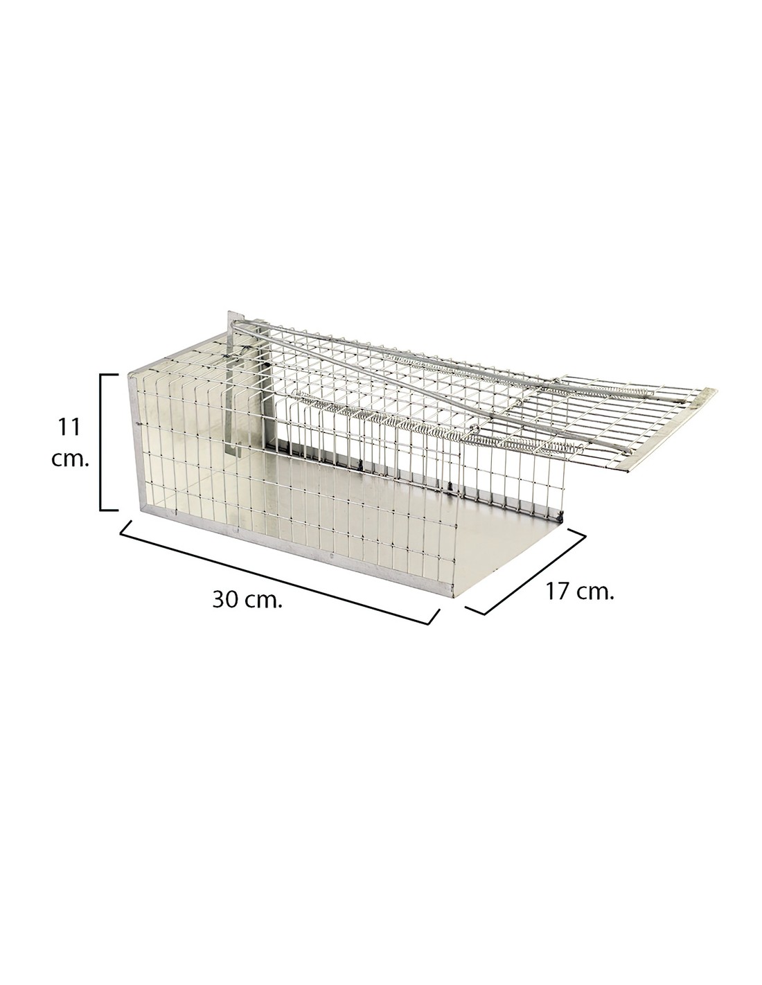 Trampa Ratas Jaula Metal. - Medida: 30x17x11 cm. - Con base de metal. - Con rejilla metalica para evitar roturas. - Articulo tambien conocido como trampa ratones, ratonera. - Con mango metálico vertical