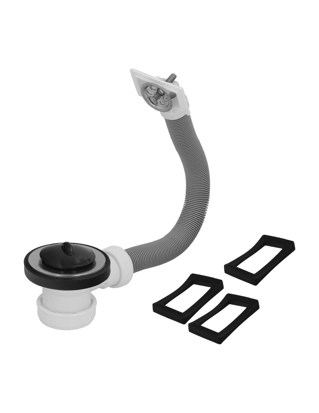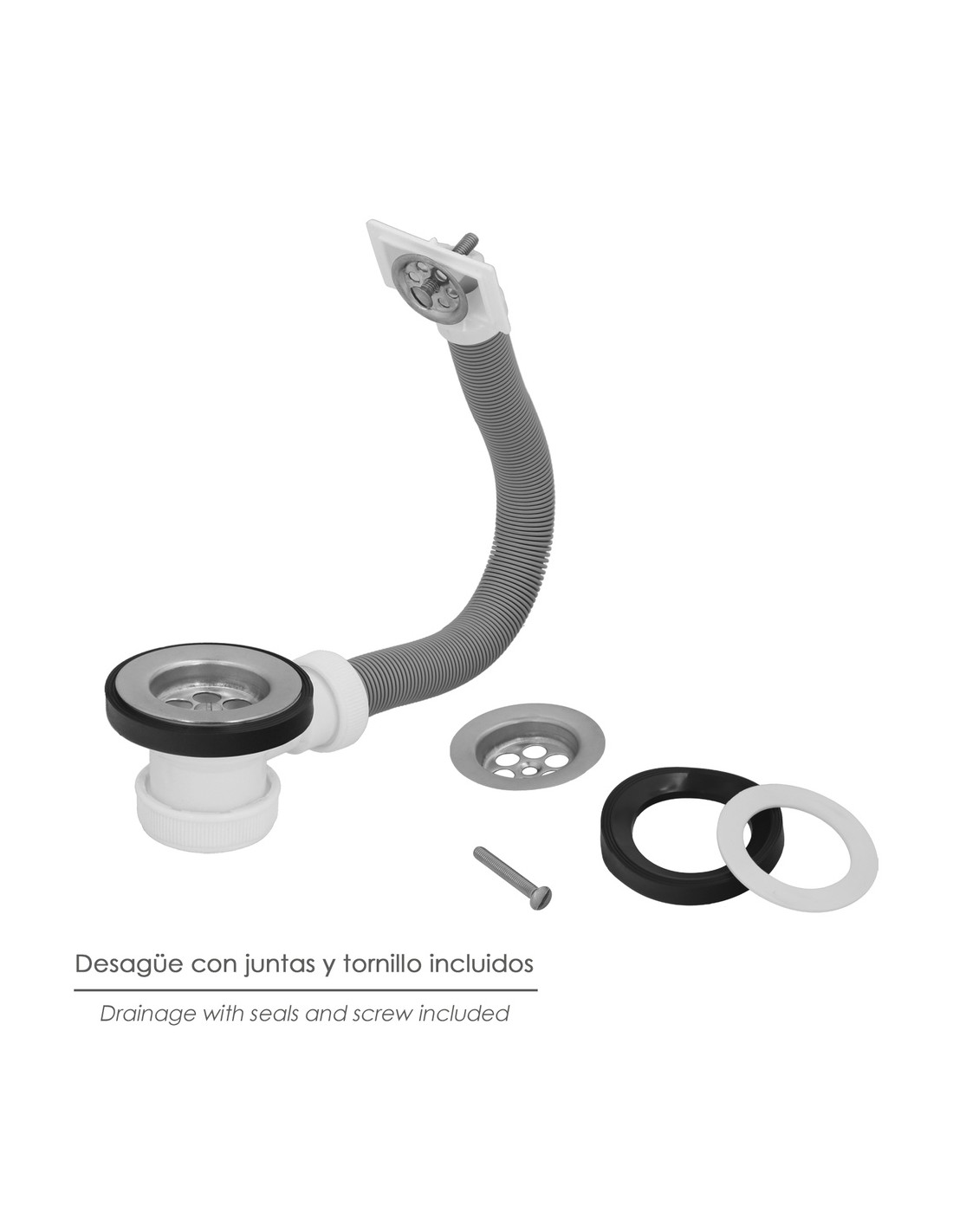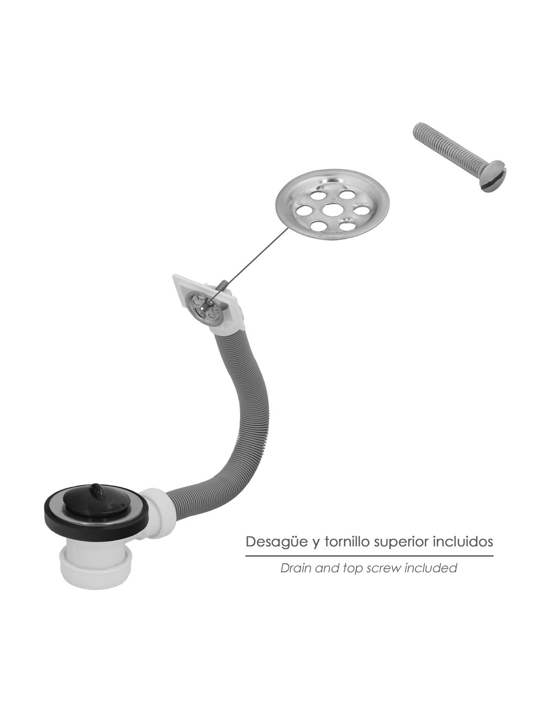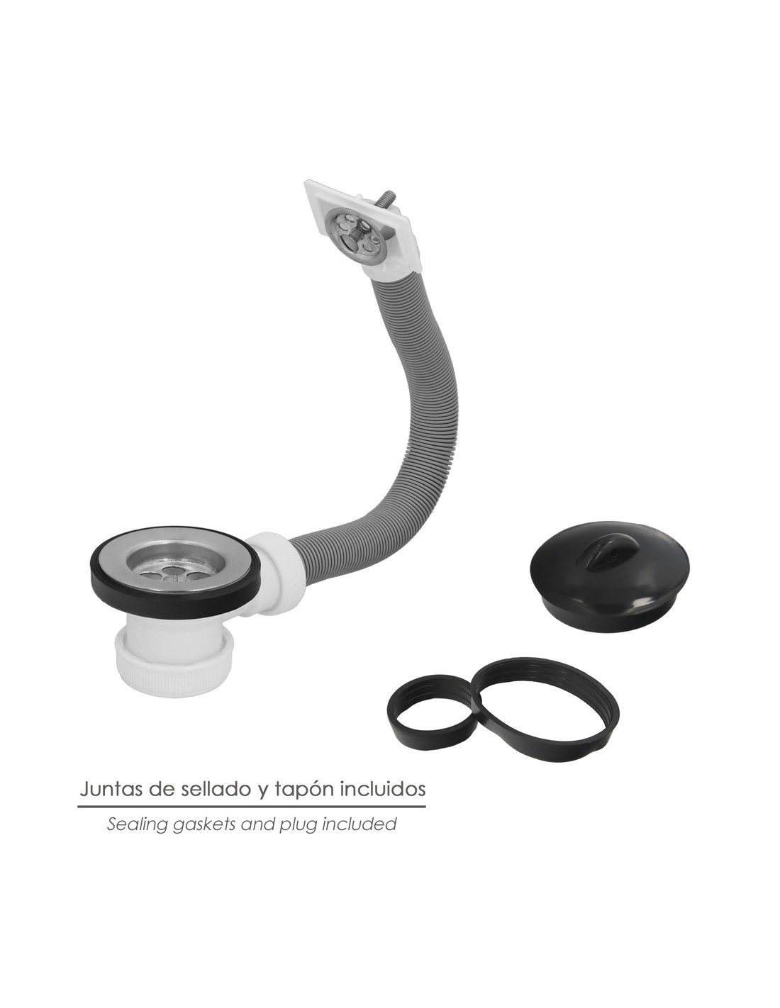- Válvula para el desagüe del fregadero. Con rebosadero. Fabricado en acero inoxidable y PVC flexible y extensible.