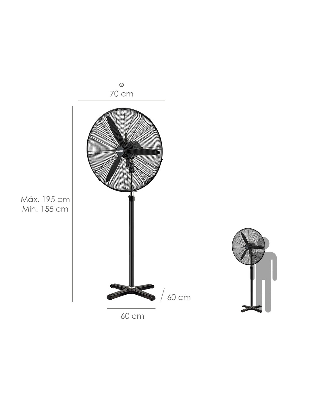 Ventilador Pie Ø 70 x195 cm. Negro 190 W. Oscilación Automatica, Altura Regulable, Cabezal Inclinable, Base Estable 60x60 cm.
