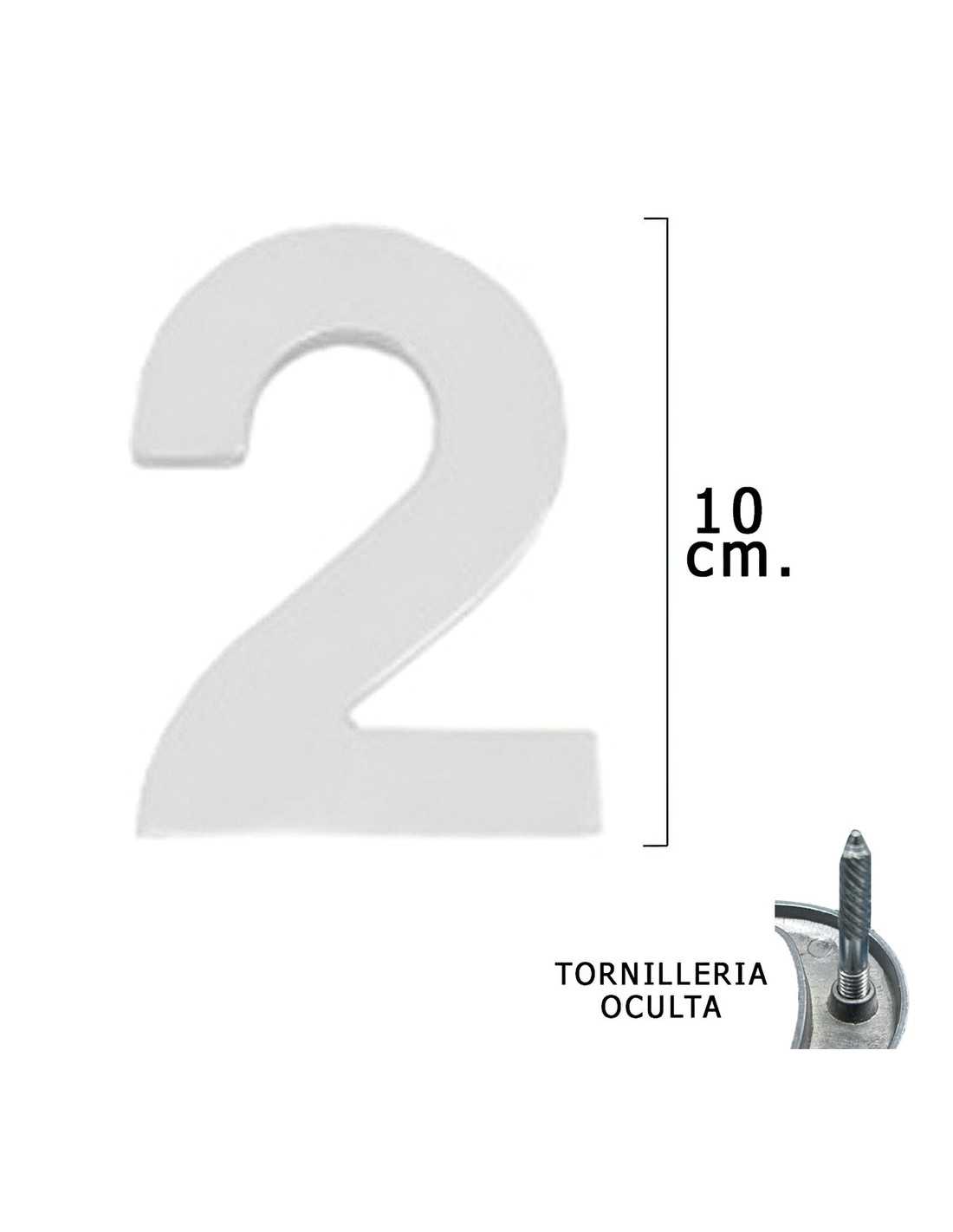 Numero Metal "2" Plateado Mate 10 cm. con Tornilleria Oculta (Blister 1 Pieza)