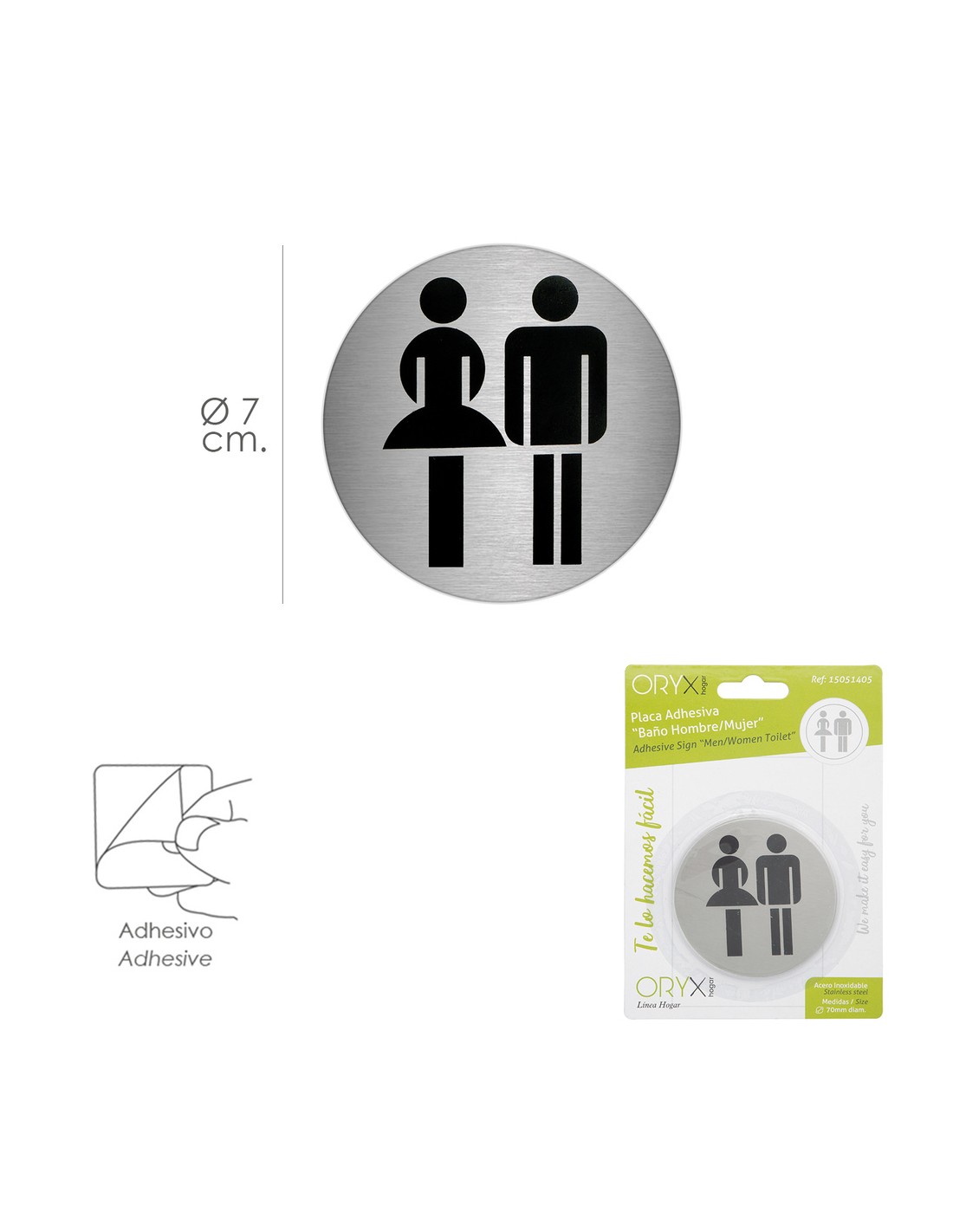Placa Adhesiva Baño "Mujer / Hombre" Acero Inoxidable Ø 7 cm.