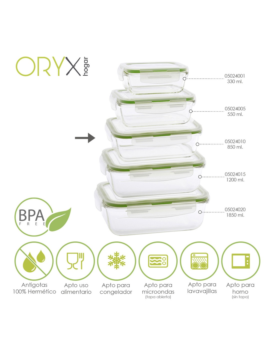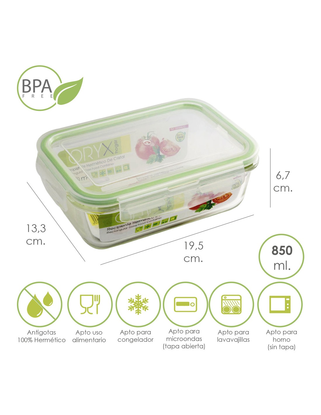 - Recipientes herméticos para una mejor conservación y un transporte sin derrames, no conserva olor ni sabor de alimentos contenidos anteriormente. Las tapas cuentan con un sistema de 4 cierres de bloqueo además están realizadas en silicona inyectada que se adhiere al cristal aislando los alimentos de gérmenes y olores externos y favoreciendo su perfecta conservación.