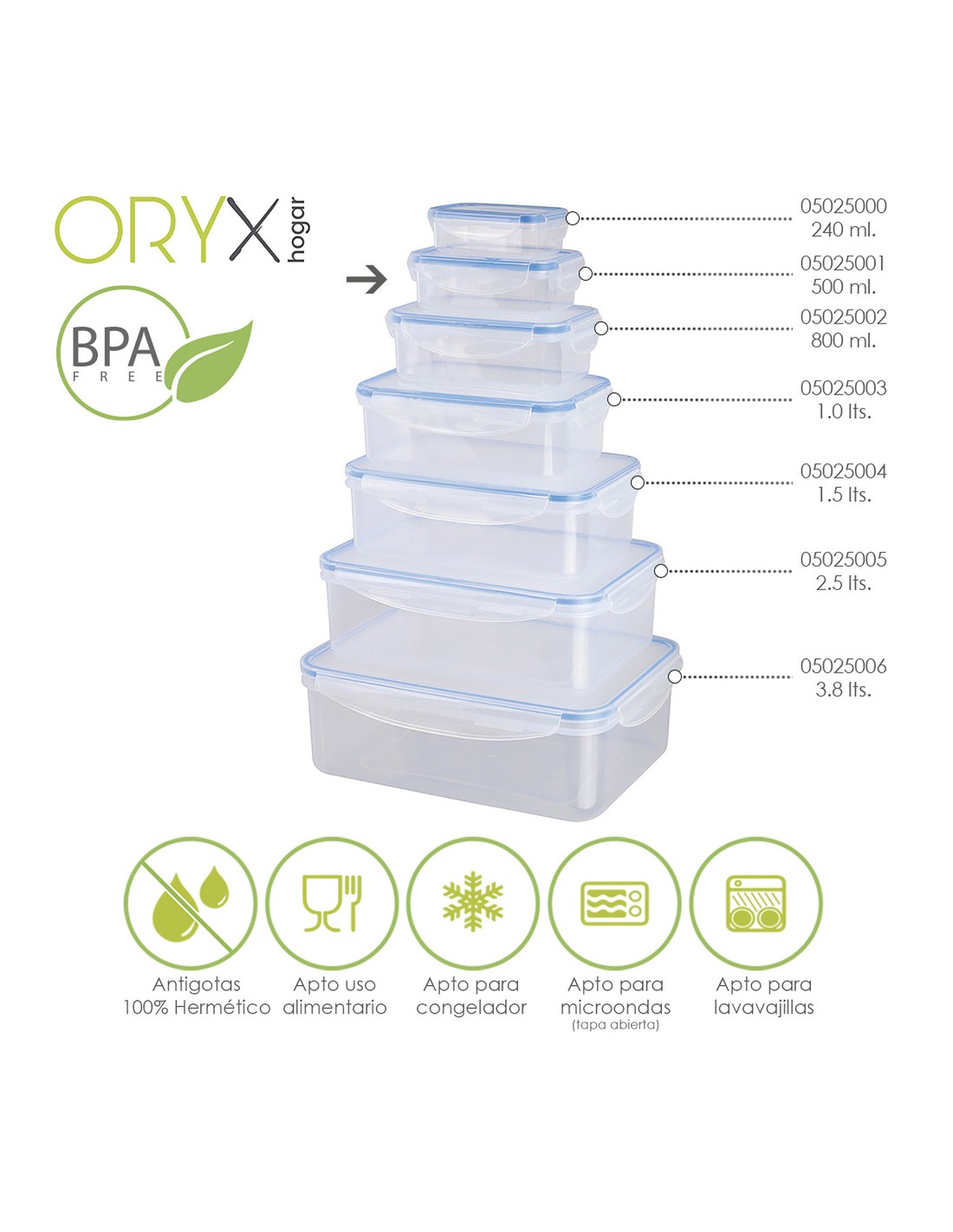 - Recipientes herméticos para una mejor conservación y un transporte sin derrames. Las tapas cuentan con un sistema de 4 cierres de bloqueo además están realizadas en silicona inyectada que se adhiere al recipiente aislando los alimentos de gérmenes y olores externos y favoreciendo su perfecta conservación.